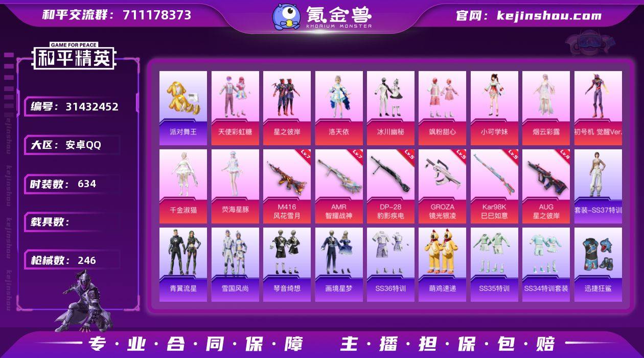 LGH556【10粉6特3飞行器紫螳螂金鞋子地铁号初号机觉醒洛天依派对舞王小可学妹天使彩虹糖素材号】(可二次实名) 安卓Q-4稀有10粉装6特效枪16热门174套装246枪皮 78909热力值 10印记 历史卓越王牌13星 【4稀有】 AKM-缤纷海域 浪漫天命 派对舞王 派对舞王(金靴子) 【10粉装】 觉醒初号机 天使彩虹糖 千金淑猫 洛天依 荧海星豚 烟云彩露 飒粉甜心 小可学妹 冰川幽秘 星之彼岸 【6特效枪】 Kar98K-巳巳如意 (5级) DP-28-豹影疾电 (5级) AMR-智耀战神 (7级) GROZA-镜光银凌 (5级) AUG-星之彼岸 (4级) M416-风花雪月 (7级) 【16热门】 8号机 Mark.06 小丑鱼 龟仙人 雪山精英 呆萌铁蟹 鹰眼刺客 暗夜行者 迅捷狂鲨 ACT追光队服 暗夜契约 粉红小猪 漫步者 破蛋小黄鸡 极速红龙 英勇保护者 【1飞行器】 星之彼岸飞行器 【2头盔】 童趣迷兔头盔 深海小丑鱼头盔 营地ID:904263164