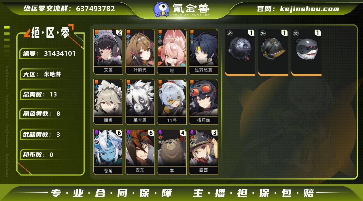 冒险等级:48 总黄数:13 五星角色数:8 菲林底片数量:0 菲林数量:0 加密母带数量:0 2命艾莲,0命叶瞬光,0命照,0命浅羽悠真,0命丽娜,0命莱卡恩,0命「11号」,0命格莉丝 6命苍角,6命安东,4命本,3命露西,3命妮可,3命可琳,2命安比,0命波可娜,0命赛斯,0命派派,0命比利 1精啜泣摇篮,1精拘缚者,1精深海访客 漪光夜曲
