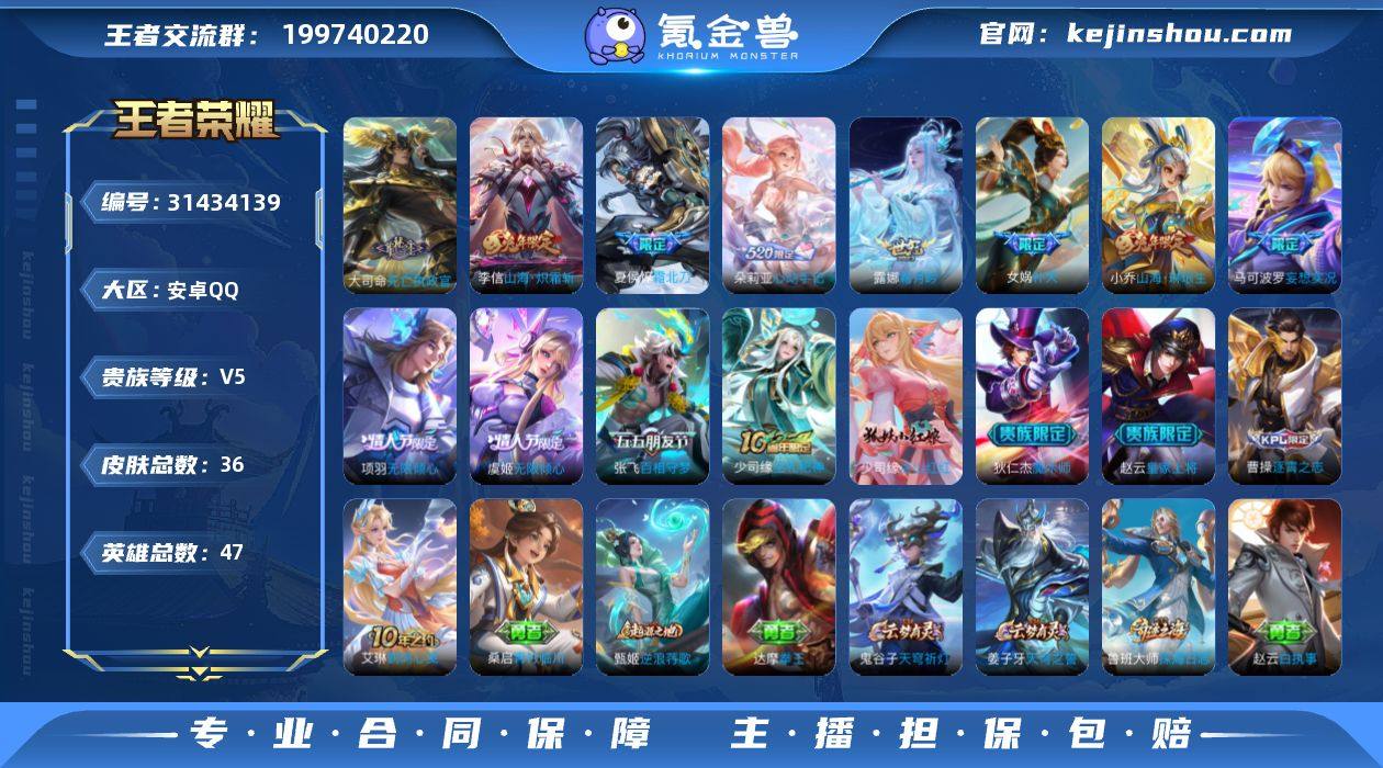 安卓Q-V5-尊贵铂金IV段位-47英雄-36皮肤-13传说-4史诗 【传说皮肤】:杨戬纵目迁山,后羿神树通天,大司命死亡执政官,夏侯惇霜北刀,朵莉亚心动手记,露娜霜月吟,马可波罗妄想实况,张飞百相守梦,虞姬无限倾心,项羽无限倾心,小乔山海琳琅生,李信山海炽霜斩,女娲补天 【限定皮肤】:夏侯惇霜北刀,姜子牙天穹之誓,小乔山海琳琅生,赵云皇家上将,马可波罗妄想实况,狄仁杰魔术师,项羽海滩派对,项羽无限倾心,张飞百相守梦,虞姬无限倾心,女娲补天,李信山海炽霜斩,鲁班大师探海日志,鬼谷子天穹祈灯,朵莉亚心动手记,周瑜熔金海岸 【年限皮肤】:小乔山海琳琅生,李信山海炽霜斩 【赛季限定】:鲁班大师探海日志,鬼谷子天穹祈灯,姜子牙天穹之誓,甄姬逆浪荇歌 【史诗皮肤】:赵云皇家上将,狄仁杰魔术师,少司缘涂山红红,少司缘巫礼祀神 【其他皮肤】:项羽海滩派对,赵云白执事,安琪拉玩偶对对碰,妲己少女阿狸,亚瑟死亡骑士,达摩拳王,鲁班大师乓乓大师,白起乐园追猎者,鲁班大师探海日志,鬼谷子天穹祈灯,姜子牙天穹之誓,周瑜熔金海岸,甄姬逆浪荇歌,桑启青衿临川,艾琳鹤鸣心笺,曹操逐霄之志,小乔万圣前夜,诸葛亮星航指挥官,李信灼热之刃 【营地ID】:1751850952