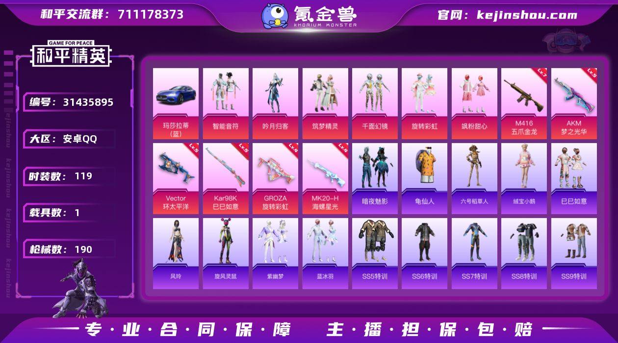 安卓 手Q-6粉装-6特效枪-1载具-1粉色飞行器-60375热力值-12王牌印记-119套装-190枪皮 【热门品类】:套装-龟仙人,角色-六号稻草人 【粉色套装】:粉装-智能音符,粉装-吟月归客,粉装-筑梦精灵,粉装-千面幻镜,粉装-旋转彩虹,粉装-飒粉甜心 【粉色枪皮等级】:AKM-梦之光华(五级),M416-五爪金龙(七级),GROZA-旋转彩虹(四级),Vector-环太平洋(五级),Kar98K-巳巳如意(五级),MK20-H-海螺星光(四级) 【粉色载具】:玛莎拉蒂Ghibli(蓝) 【粉色枪皮】:AKM-梦之光华,M416-五爪金龙,GROZA-旋转彩虹,Vector-环太平洋,Kar98K-巳巳如意,MK20-H-海螺星光 【粉色飞行器】:闪光银龙飞行器 【粉色降落伞】:四圣焕新降落伞,银刃赛罗降落伞,恐龙拽拽降落伞,庄周梦蝶降落伞,炙焰牛王降落伞,环太平洋降落伞,彩虹甜喵降落伞,甜蜜草莓降落伞,千面幻镜降落伞,旋转彩虹降落伞,暗夜鎏金降落伞,音爆索尼克降落伞 【稀有套装】:套装-龟仙人,套装-绒宝小鹅,套装-巳巳如意,角色-风玲,套装-旋风灵鼠,套装-紫幽梦,套装-蓝冰羽,角色-六号稻草人 【稀有枪皮】:AKM-夜灯,AKM-彩虹符号,AKM-灼热熔岩,AKM-环太平洋,AKM-生命誓言,AKM-破晓战魂,AKM-虎虎生威,AKM-霓虹街区,AKM-龙的传人,M16A4-幻世战舞者,M16A4-甜心亚梦,M16A4-红色方程式,M16A4-蓝色火焰,SCAR-L-炫彩节奏,SCAR-L-玉兔迎春,SCAR-L-王牌四分卫,SCAR-L-红色方程式,SCAR-L-青丘仙客,M416-夜灯,M416-暗夜行者,M416-暗星紫秘,M416-糯团青竹,M416-红色方程式,M416-绿野极光,M416-蓝色火焰,GROZA-异彩先驱,GROZA-彩虹符号,GROZA-恐龙拽拽,GROZA-治愈之星,GROZA-田园牧歌,AUG-耀粉歌者,AUG-青春冒险家,QBZ-彩虹符号,QBZ-飞驰魅影,M762-天降萌叽,M762-奇异狩猎者,M762-彩虹甜喵,M762-牛气冲天,M762-瑞龙福将,M762-...