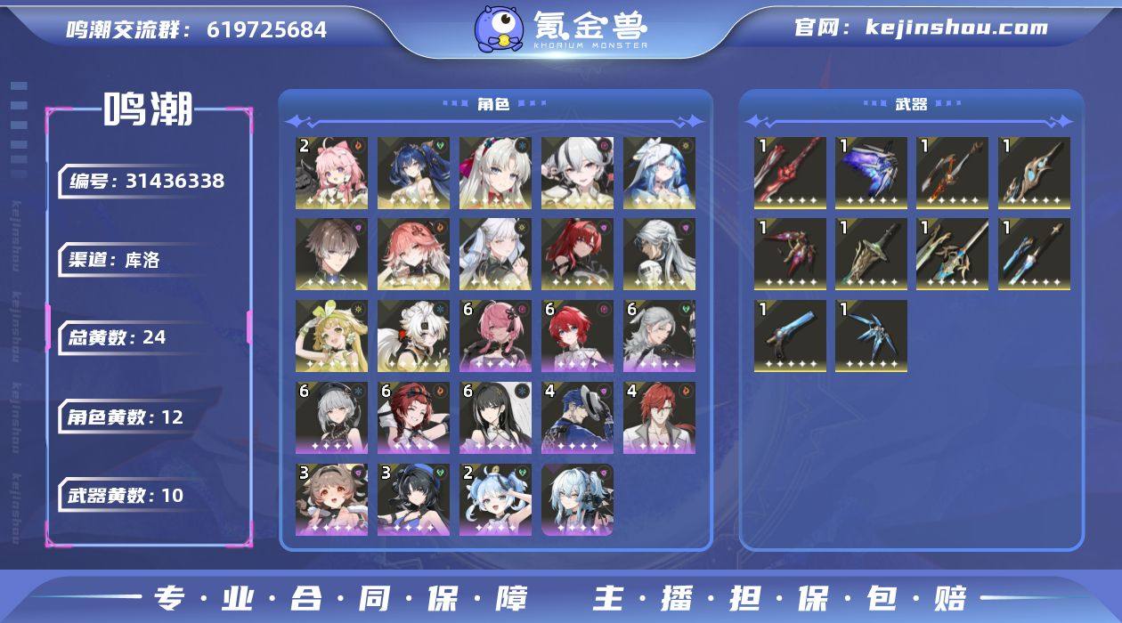 总黄数: 24 联觉等级: 76拥有五星共鸣者: 卡卡罗,安可,维里奈,吟霖,今汐,长离,相里要,守岸人 ,尤诺,椿,凌阳,珂莱塔,拥有五星武器: 掣傀之手,苍鳞千嶂,千古洑流,漪澜浮录,时和岁稔,赫奕流明,星序协响,裁春,停驻之烟退游了有挺久没有玩了