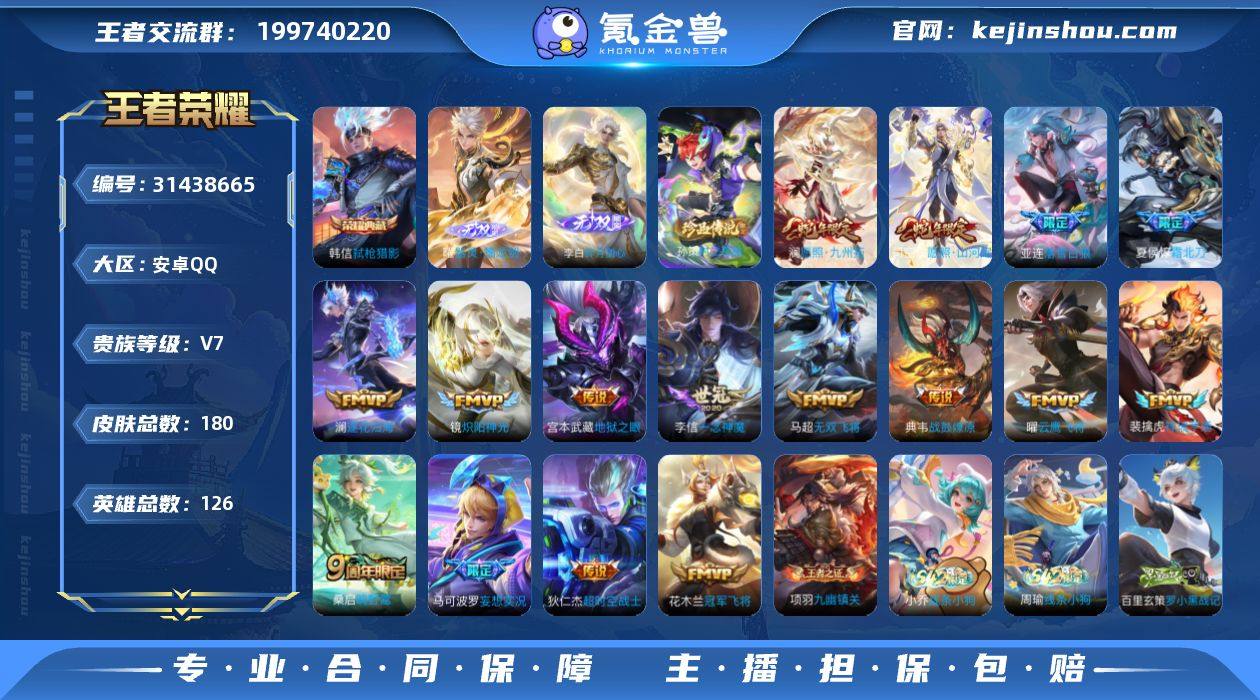安卓Q-V7-至尊星耀IV段位-126英雄-180皮肤-1典藏皮肤-2无双-1珍品传说-17传说-49史诗 【英雄全皮】:司空震全皮 【荣耀典藏】:韩信弑枪猎影 【无双皮肤】:李白碎月剑心,曜器灵螭龙剑 【珍品传说】:孙策时之奇旅 【传说皮肤】:后羿神树通天,司空震愿照山河定,澜愿照九州拓,裴擒虎祥瑞亨通,桑启鸣野蒿,夏侯惇霜北刀,亚连落雪白狼,典韦战鼓燎原,澜逐花归海,马可波罗妄想实况,马超无双飞将,镜炽阳神光,曜云鹰飞将,李信一念神魔,花木兰冠军飞将,宫本武藏地狱之眼,狄仁杰超时空战士 【限定皮肤】:夏侯惇霜北刀,蒙犽顽岩魄,姜子牙天穹之誓,李白谪仙醉月,狄仁杰阴阳师,赵云皇家上将,庄周高山流水,元歌无心,马可波罗山海玄木吟,马可波罗妄想实况,狄仁杰魔术师,项羽海滩派对,关羽百相守梦,孙悟空孙行者,后羿如梦令,干将莫邪胡桃夹子,百里玄策原初追逐者,司空震地狱燃心,鬼谷子天穹祈灯,李白碎月剑心,百里玄策超元猎域,亚连落雪白狼,沈梦溪龙舞盛年,刘邦剑破天穹,程咬金群星魔术团,刘备异域游侠,周瑜熔金海岸 【年限皮肤】:马可波罗山海玄木吟,司空震愿照山河定,澜愿照九州拓 【赛季限定】:鬼谷子天穹祈灯,刘邦剑破天穹,姜子牙天穹之誓,东皇太一噬灭天穹,太乙真人谧流熔炉,钟馗虚灵犬护,甄姬逆浪荇歌,亚瑟荣光之誓,百里玄策原初追逐者,项羽九幽镇关 【战令限定】:司空震地狱燃心,周瑜百相守梦,孙策百相守梦,莱西奥光弋星穹,明世隐往忆晖光,周瑜线条小狗,小乔线条小狗 【史诗皮肤】:鲁班七号电玩小子,赵云皇家上将,貂蝉圣诞恋歌,王昭君偶像歌手,狄仁杰魔术师,廉颇地狱岩魂,宫本武藏鬼剑武藏,孙尚香水果甜心,嬴政摇滚巨星,墨子金属风暴,曹操幽灵船长,刘邦德古拉伯爵,兰陵王暗隐猎兽者,诸葛亮黄金分割率,雅典娜冰冠公主,百里守约特工魅影...