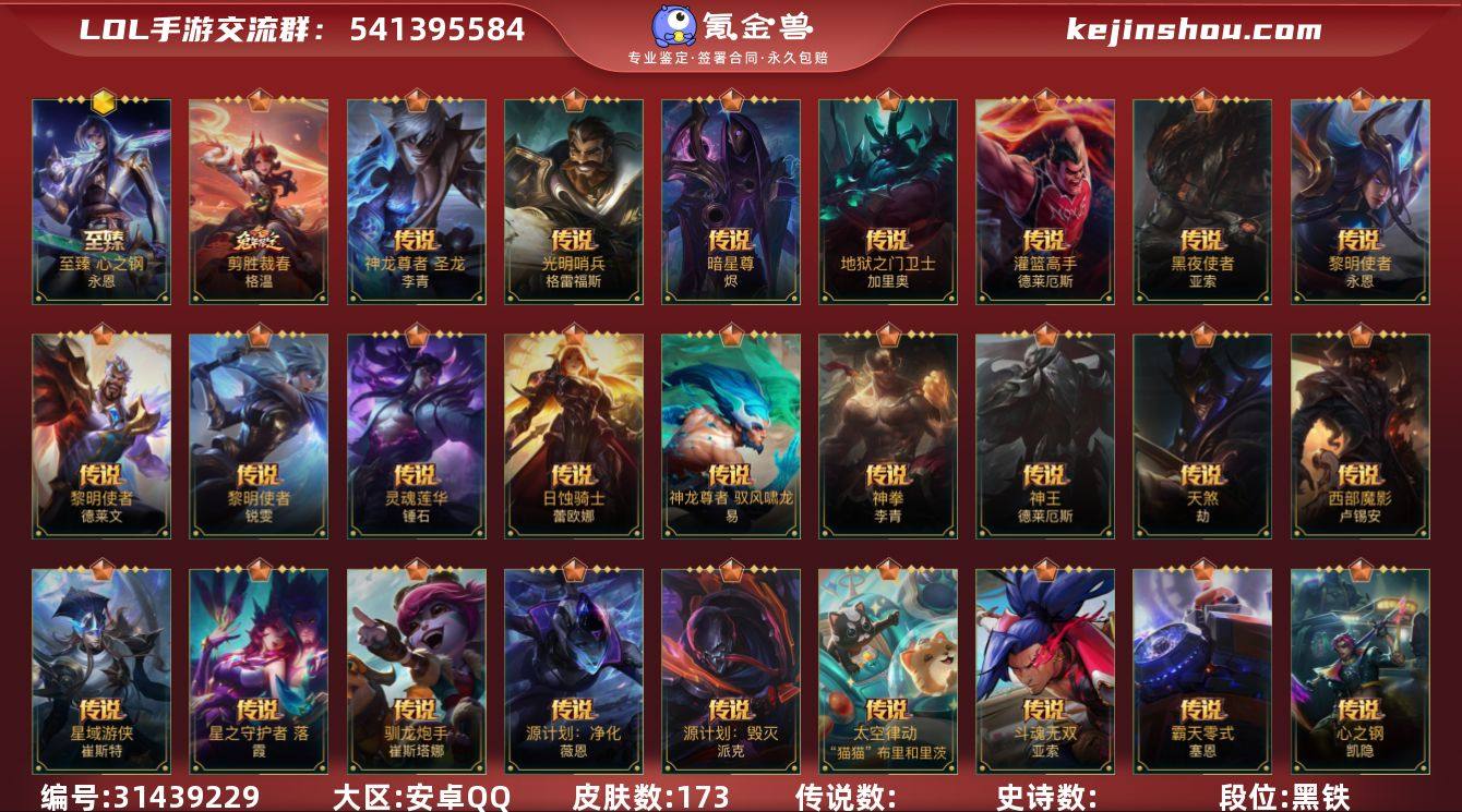 119英雄-173皮肤 【神话皮肤】:天命豪赌 瑟提,至臻 心之钢 永恩 【限定皮肤】:掠星魔刃 卡萨丁,吕布 奉先 嘉文四世 【传说皮肤】:海魔至尊 亚托克斯,心之钢 凯隐,源计划:净化 薇恩,暗星尊 烬,星域游侠 崔斯特,太空律动 “猫猫”布里和里茨 布里茨,源计划:超体 莫德凯撒,黑夜使者 亚索,斗魂无双 亚索,天煞 劫,西部魔影 卢锡安,日蚀骑士 蕾欧娜,驯龙炮手 崔丝塔娜,星之守护者 落 霞,剪胜裁春 格温,神拳 李青,神龙尊者 圣龙 李青,黎明使者 永恩,神龙尊者 驭风啸龙 易,灌篮高手 德莱厄斯,神王 德莱厄斯,光明哨兵 格雷福斯,黎明使者 德莱文,黎明使者 锐雯,地狱之门卫士 加里奥,源计划:毁灭 派克,霸天零式 赛恩,灵魂莲华 锤石 【史诗皮肤】:钢铁军团 盖伦,霸天剑魔 亚托克斯,腥红之月 亚托克斯,殇之机器人 阿木木,劲道美味 阿木木,黑夜使者 凯隐,霸天战士 雷恩加尔,黎明使者 卡尔玛,小蜜蜂 努努和威朗普,探梦奇旅 艾克,暗星 奥莉安娜,腥红之月 黛安娜,光明哨兵 黛安娜,恶魔之刃 泰达米尔,猎龙勇士 赵信,霸天异形 卡兹克,猎梦吞噬者 卡兹克,电玩战魂 赫卡里姆,战斗校长 悠米,烘焙童谣 悠米,礼物选好了吗? 布隆,斗魂觉醒 烬,灰烬领主 奥瑞利安·索尔,圣龙 奥瑞利安·索尔,东恒之曜 奥瑞利安·索尔,K/DA ALL OUT 卡莎,魅惑女巫 莫甘娜,玉剑传说 无双 菲奥娜,战场之王 布里茨,战场之王 亚索,灵魂莲华 亚索,武神 贾克斯,屠龙勇士 凯尔,我,羽饰骑士 崔丝塔娜,星之守护者 璐璐,炼狱魔女 蔚,永恒之森 霞,永恒之森 洛,吕布 奉先 嘉文四世,电玩魔爵 佛耶戈,地下拳王 李青,奈落之炎 凯南,梦境绅探 凯南,源计划:燃 泽丽,神龙尊者 炎龙 瑟提,心之钢 永恩,灵魂莲华 易,喵凯 茂凯,灵魂收割者 德莱文,冰川巨兽 墨菲特,暗星 墨菲特,虚空海灵 菲兹...