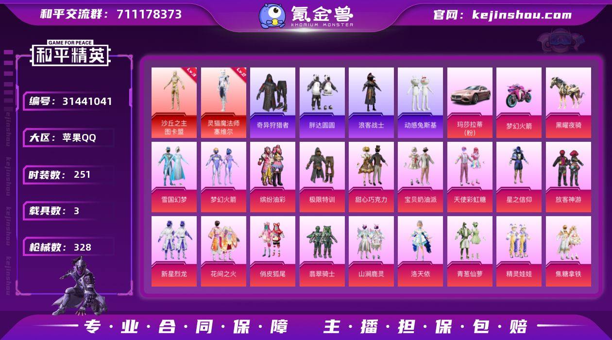 安卓 手Q-2神装-21粉装-13特效枪-1载具-6粉色飞行器-91305热力值-17王牌印记-178套装-246枪皮 【红色神装等级】:镜域双华-欧若拉(二级),沙丘之主-图卡盟(二级) 【热门品类】:粉装-童趣迷兔,套装-都市猎人,套装-深海小丑鱼,套装-奇异狩猎者,角色-军刀雅典娜,套装-胖达团团,套装-龟仙人 【粉色套装】:粉装-甜心巧克力,粉装-宝贝奶油派,粉装-天使彩虹糖,粉装-放客神游,粉装-极致幻想,粉装-童趣迷兔,粉装-炙焰红王,粉装-蜜桃特工,粉装-恐龙拽拽,粉装-甜梦小狐,粉装-暖熊萌萌,粉装-傲雪凌霜,粉装-霁雪冰心,粉装-冰川幽秘,粉装-冰川红玫,粉装-未来歌姬,粉装-傲傲奶龙,角色-小叽联名款,角色-严莉莉,角色-美琪,粉装-星穹咏叹调 【粉色枪皮等级】:AKM-甜心宝贝(五级),SCAR-L-童趣迷兔(五级),SCAR-L-青春物语(一级),M416-心之恋语(五级),M416-墨龙九天(三级),M762-甜蜜誓约(五级),UMP45-恐龙拽拽(五级),P90-沙丘之主(三级),Kar98K-巳巳如意(五级),M24-镜域双华(三级),SPAS-12-蜜语绒猫(二级),DP-28-豹影疾电(五级),MG3-酷泡奶龙(四级) 【粉色载具】:宾利飞驰(布罗德盖棕双色) 【粉色枪皮】:AKM-甜心宝贝,SCAR-L-童趣迷兔,SCAR-L-青春物语,M416-心之恋语,M416-墨龙九天,M762-甜蜜誓约,UMP45-恐龙拽拽,P90-沙丘之主,Kar98K-巳巳如意,M24-镜域双华,SPAS-12-蜜语绒猫,DP-28-豹影疾电,MG3-酷泡奶龙 【粉色飞行器】:炫彩糖果飞行器,暖熊萌萌飞行器,太空嘟嘟飞行器,沙丘之主天马,镜域双华-灵镜之阶,极意拳锋飞行器 【粉色降落伞】:甜心宝贝降落伞,甜蜜誓约降落伞,童趣迷兔降落伞,恐龙拽拽降落伞,甜梦小狐降落伞,环太平洋降落伞,暖熊萌萌降落伞,垂柳戏鸭降落伞,冰川粉黛降落伞,第五大道降落伞,沙丘之主降落伞,小叽联名款降落伞,蜜语绒猫降落伞,镜域...