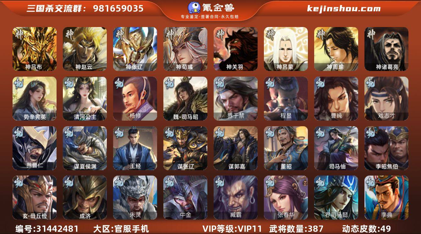 官阶:大将军;VIP等级:VIP11;史诗武将数量:61;动态皮肤数量:74;武将总数:392;史诗宝珠数量:10;将魂数量:6317;神将:9;魏国史诗武将:37;蜀国史诗武将:11;吴国史诗武将:8;群史诗武将:20 神吕布,神赵云,神甘宁,神张辽,神郭嘉,神太史慈,神孙策,神吕蒙,神周瑜,星周不疑,王粲,杨修,文鸯,王元姬,王凌,魏-司马昭,马钧,界钟会,界于禁,界曹真,郝昭,曹婴,曹纯,戏志才,刘晔,清河公主,关索,马云騄,谋赵云,谋马超,诸葛瞻,周群,赵襄,王平,谯周,花鬘,董允,谋黄盖,吴景,孙寒华,骆统,留赞,界朱然,界徐盛,贺齐,谋黄月英,谋貂蝉,左慈,郑玄,张琪瑛,星黄忠,苏飞,麹义,南华老仙,祢衡,沮授,界李儒,公孙康,杜预,卑弥呼,鲍信,阎象,许攸,友徐庶,星董卓,神鲁肃-九州为局,神郭嘉-虎年清明(动态),神赵云-鳞振九霄,神甘宁-万人辟易(动态),神吕蒙-兼资文武(动态),神吕布-监兵噬魅(动态),神赵云-战龙在野(动态),星周不疑-才广志宏(动态),曹植-龙年中秋(动态),曹丕-气荡山河(动态),曹丕-龙年中秋(动态),SP蔡文姬-兔年冬日(动态),许褚-兔年端午(动态),许褚-虎啸生风(动态),界许褚-虎啸生风(动态),钟会-谋谟之勋(动态),界钟会-谋谟之勋(动态),戏志才-举棋若定(动态),曹婴-兔年春节(动态),朱灵-以战破氐(动态),曹纯-长坂败备(动态),王元姬-鼠年冬至(动态),司马师-牛年中秋(动态),司马昭-昭威淮南(动态),星徐晃-斧引霹雳(动态),清河公主-魅影萦心(动态),关羽-明良千古(动态),马超-牛年春节(动态),马超-明良千古(动态),诸葛瞻-绵竹之殇(动态),界马超-牛年春节(动态),张星彩-虎年端午(动态),关索-虎年七夕(动态),鲍三娘-柳娇桃艳(动态),李丰-太仓聚粟(动态),胡金定-明良千古(动态),马良-荡然由心(动态),诸葛果-蛇年限定(动态),太史慈-涤荡江东(动态),周处-义除三害(动态),吕蒙-剑起惊澜(动态),黄盖-以身证道(动态),孙策-虎踞江东(动态),孙寒华...