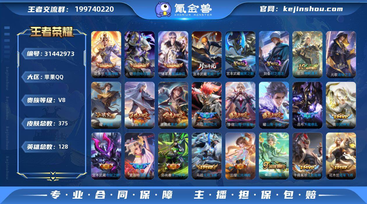 贵族等级:V8 典藏皮肤数:3 珍品无双皮肤数:0 无双皮肤数:0 珍品传说皮肤数:1 传说皮肤数:21 史诗皮肤数:105 皮肤数:375 英雄数:128 段位:王者 卖家说:万战宫本
