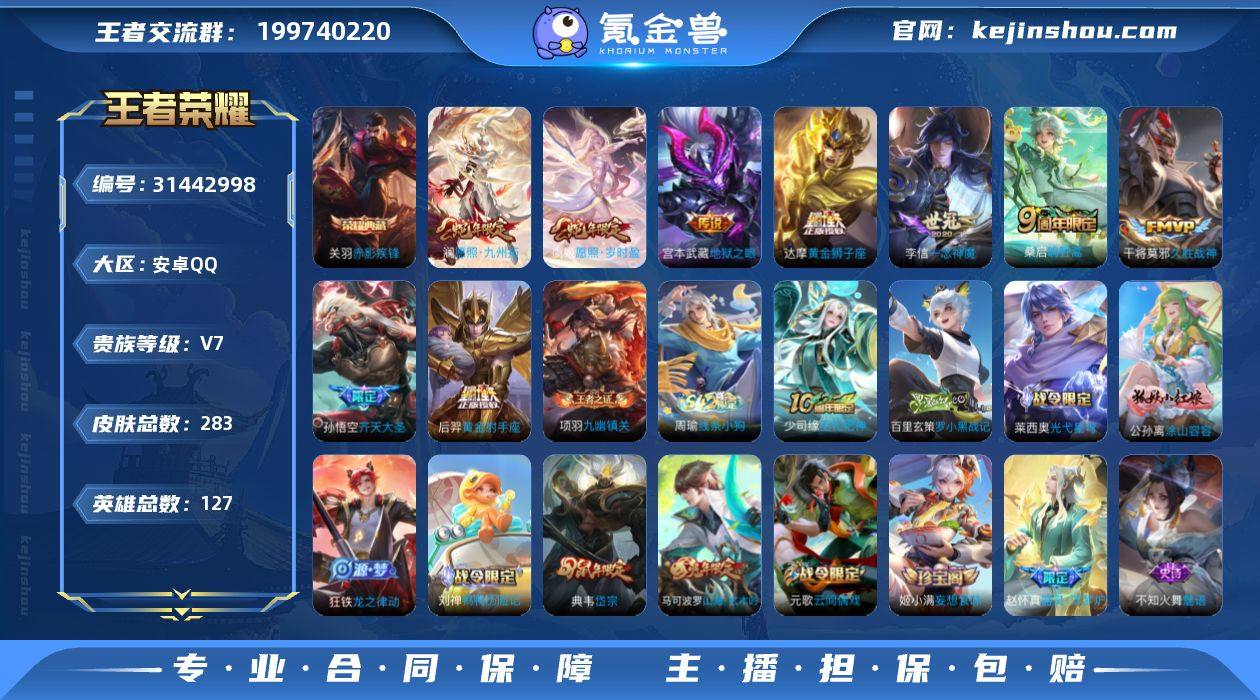 对抗57段 小国万战达摩 金标万战张飞 金标万战盾山 金标万战狂铁 金标万战韩信 安卓Q-V7-至尊星耀III段位-127英雄-283皮肤-1典藏皮肤-9传说-82史诗 【英雄全皮】:孙权全皮,蒙恬全皮,空空儿全皮,影全皮 【荣耀典藏】:关羽赤影疾锋 TD2602114 【传说皮肤】:澜愿照九州拓,虞姬愿照岁时盈,桑启鸣野蒿,孙悟空齐天大圣,李信一念神魔,干将莫邪久胜战神,达摩黄金狮子座,后羿黄金射手座,宫本武藏地狱之眼 【限定皮肤】:蔡文姬夏日便利店,虞姬夏日便利店,姜子牙天穹之誓,狄仁杰阴阳师,赵云皇家上将,墨子神迹守卫,高渐离玩趣恶龙,钟无艳超时空战士,扁鹊奇幻香踪,白起夜都怪侠,芈月幻夜卜梦,元歌云间偶戏,元歌无心,甄姬落雪兰心,典韦岱宗,马可波罗山海玄木吟,狄仁杰魔术师,狄仁杰万华元夜,达摩星际陆战队,达摩沙漠行僧,项羽海滩派对,老夫子醍醐杖,程咬金演武夺筹,兰陵王金庭之子,亚瑟潮玩骑士王,孙悟空齐天大圣,后羿圣弓游侠,李元芳银河之约,李元芳云中旅人,虞姬霸王别姬,杨玉环遇见飞天,杨戬潮玩骑兵,女娲朔望之晖,干将莫邪真爱魔法,鬼谷子原初探秘者,鬼谷子五谷丰年,黄忠火炮绅士,苏烈千军破阵,百里玄策原初追逐者,弈星混沌棋,梦奇顽趣,沈梦溪星空之诺,沈梦溪大漠名商,明世隐疑决卦,明世隐吟游魔法,裴擒虎擒涛扼浪,米莱狄胡桃异想国,云中君纤云弄巧,盾山御銮,上官婉儿梁祝,鲁班大师探海日志,桑启海盐诗旅,阿古朵江河有灵,张良古海寻踪,蒙犽百解令,蒙恬荣光圣徽,高渐离燃音魔法,妲己灵卜魔法,鬼谷子天穹祈灯,姬小满妄想食味,鲁班七号蔬乡物语,李元芳蔬乡物语,刘邦剑破天穹,程咬金群星魔术团 【年限皮肤】:典韦岱宗,马可波罗山海玄木吟,澜愿照九州拓,虞姬愿照岁时盈 【赛季限定】:盾山御銮,弈星混沌棋,明世隐疑决卦,老夫子醍醐杖,鬼...