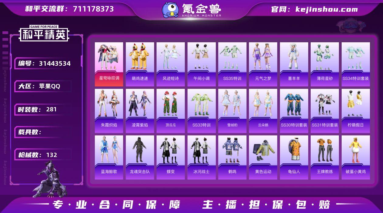 苹果手Q-5王牌印记-1粉装-5特效枪-35362热力值-74套装-132枪皮-1卓越印记 【1粉装】套装-星穹咏叹调 【5特效枪】Mk14-福马献瑞/5级,DP-28-豹影疾电/5级,GROZA-镜光银凌/5级,Kar98K-巳巳如意/5级,AKS-74U-森灵之息/5级 【2稀有紫装】小丑鱼,龟仙人 【71稀有时装】星穹咏叹调,SS35特训,午间小调,SS31特训,SS33特训,SS32特训,SS36特训,蓝冰羽,雪绒豹,恋语绒绒,星渊小夜曲,SS34特训,朱霞炽焰,紫幽梦,狂鲨锋刃,大橘大利,喜羊羊,龟仙人,小丑鱼,凌霄紫焰,萌鸡速递,元气之梦,风迹短诗,薄荷星砂,蓝海鲸歌,云朵鹅,顶瓜瓜,雪国风尚,石蕴玉辉,龙魂突击队,异域银装,蓝调潮影,街头风暴,星途旅人,冰河战士,鱼渊荷华,俏兔智灵,SS30特训,青团波波,拉斐尔,燕燕于飞,风玲,战术大师,智谋强哥,糖糖葫芦,晶辉守护,蝶变,巳巳如意,棉花软糖,SS28特训,焰鹰斗篷,黄色运动,顽皮玉兔,热情海星,纯真浪花,竞技名士,长空猛禽,冰冻风暴,破蛋小黄鸡,超能勇士,海岛探路者,森林游猎者,SS27特训,光之冒险,玉兔迎春,弄潮海豚,缤纷果语,幻羽潜行,王牌教练,柠萌假日,鹤鸣 【122稀有枪械】QBZ-纯真浪花,AWM-纯真浪花,汤姆逊-纯真浪花,DBS-乌木金纹,AA12-G-纯真浪花,平底锅-纯真浪花,SCAR-L-海盐豹豹,GROZA-镜光银凌/5级,Kar98K-巳巳如意/5级,AKS-74U-森灵之息/5级,DP-28-豹影疾电/5级,Mk14-冰河战士,Vector-突变脉冲,UZI-冰河战士,M16A4-冰河战士,MK20-H-乌木金纹,DBS-风迹短诗,莫辛纳甘-风迹短诗,Win94-乌木金纹,MK12-风迹短诗,MK12-乌木金纹,撬棍-冷漠罗丽,PKM-紫幽梦,MG3-霓彩脉冲,Mk14-紫幽梦,蜜獾-乌木金纹,M762-云朵鹅,S1897-紫幽梦,SVD-云朵鹅,P92-紫幽梦,SPAS-12-狂鲨锋刃,MK20-H-狂鲨锋刃,UZI-炫彩糖果,M416-萌萌史莱姆,短管