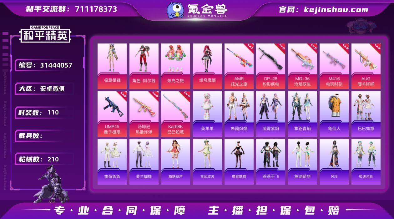 【店主推荐捡漏号!可直接换绑】安卓 微信-4粉装-9特效枪-0载具-5粉色飞行器-58758热力值-8王牌印记-110套装-210枪皮【热门品类】:套装-龟仙人【粉色套装】:角色-阿尔茜,粉装-炫光之旅,角色-绯穹魔姬,粉装-极意拳锋【粉色枪皮等级】:M416-电玩时刻(五级),AUG-暖羊咩咩(五级),UMP45-量子极限(五级),汤姆逊-热量炸弹(五级),AKS-74U-森灵之息(五级),Kar98K-巳巳如意(五级),AMR-炫光之旅(七级),DP-28-豹影疾电(五级),MG-36-沧焰双生(五级)【粉色枪皮】:M416-电玩时刻,AUG-暖羊咩咩,UMP45-量子极限,汤姆逊-热量炸弹,AKS-74U-森灵之息,Kar98K-巳巳如意,AMR-炫光之旅,DP-28-豹影疾电,MG-36-沧焰双生【粉色飞行器】:太空嘟嘟飞行器,变形金刚飞行器,萌物绒绒飞行器,繁龙极客飞行器