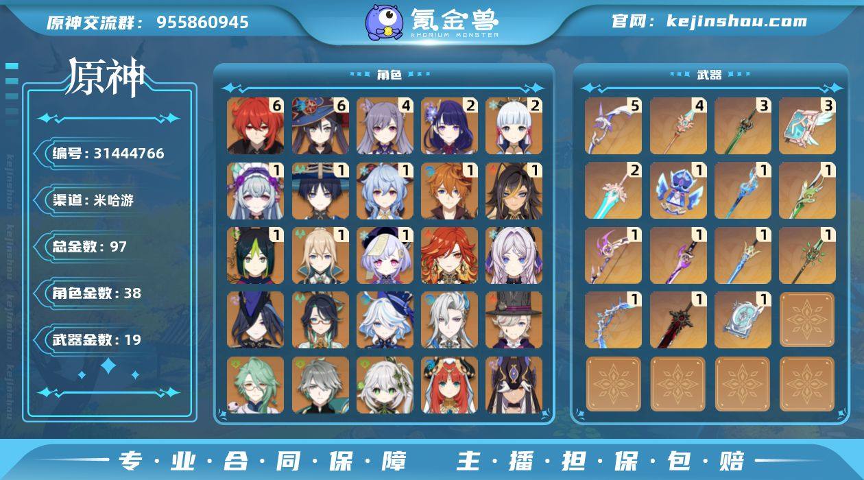 60级/97黄/女主/38个五星角色/19个五星武器 0命克洛琳德,0命闲云,0命芙宁娜,0命那维莱特,0命林尼,0命白术,1命迪希雅,0命艾尔海森,1命流浪者,0命纳西妲,0命妮露,0命赛诺,1命提纳里,0命夜兰,0命神里绫人,0命八重神子,0命申鹤,0命荒泷一斗,2命雷电将军,0命枫原万叶,2命神里绫华,0命钟离,1命甘雨,0命魈,0命宵宫,0命温迪,0命可莉,1命达达利亚,4命刻晴,1命七七,1命琴,满命莫娜,满命迪卢克,0命玛薇卡,0命茜特菈莉,1命梦见月瑞希,0命杜林,0命兹白,精1静水流涌之辉,精1裁叶萃光,精1冬极白星,精1飞雷之弦振,精1雾切之回光,精1苍古自由之誓,精3磐岩结绿,精1四风原典,精1和璞鸢,精4天空之脊,精5阿莫斯之弓,精3天空之卷,精1狼的末路,精2天空之傲,精1祭星者之望