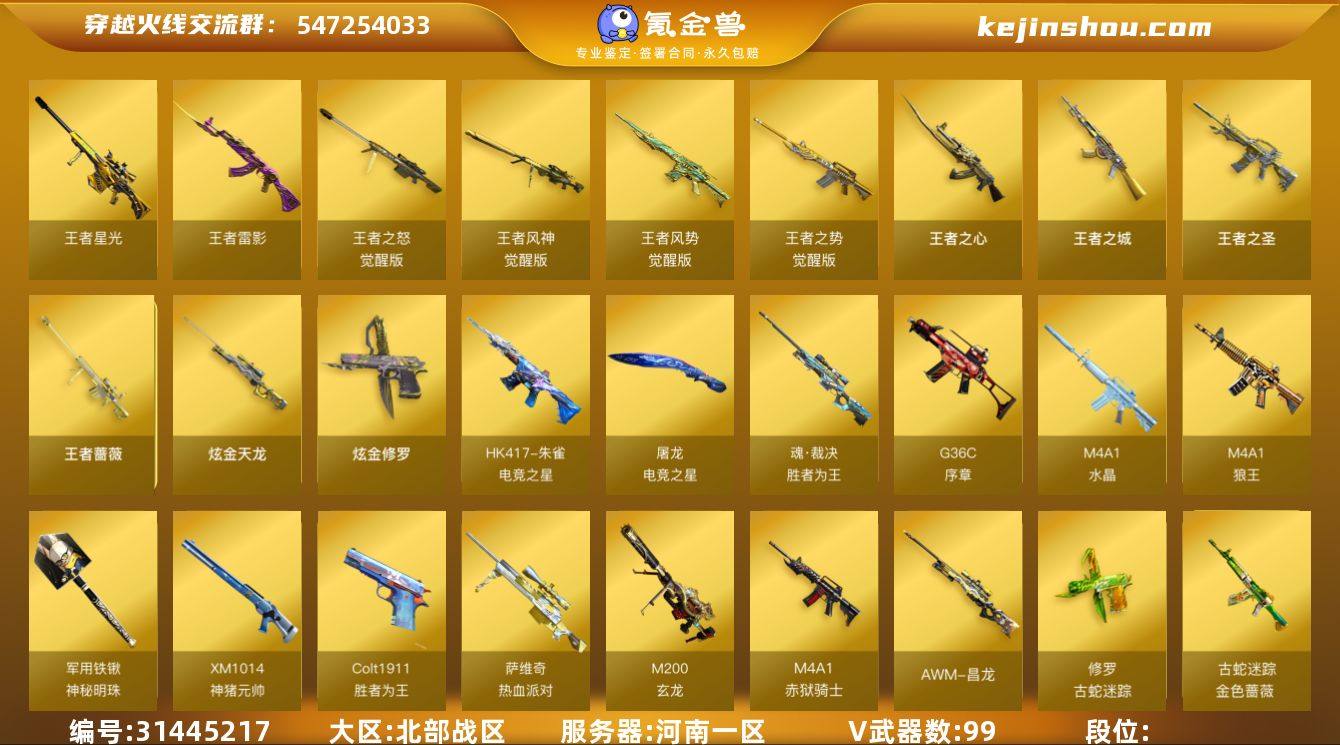 北部战区(河南一区)lb【质量爆破号】99v【M200-幻神套装+三皮(荣耀世冠白鲨2023+女团+曹操+幻神音效),M200-竞技荣光,王者风神,古蛇迷踪套装,G36C-幻影,QBZ03-金色蔷薇套装+双皮/量子蔷薇/Heartshot,炽芒蝶刃+皮/白鲨2023,AWM-裁决+双皮/流光秘银/羽擎,5修罗,柯尔特-荣耀世冠白鲨2023*3,HK417-朱雀-电竞之星,ScarLight-马枪,Colt1911-大黄蜂,胡萝卜匕首】10王者【王者风神,王者星光,王者风势,王者雷影,王者之城,王者之心,王者之圣,王者之势,王者蔷薇,王者之怒】2炫金【炫金天龙,炫金修罗】11角色【四防晴雅,关小雨,零,战地猎狐,蛇隐宗,幻面灵狐,王者之瞳,王者岚兮儿,乔伊教练,云海玲珑,奇洋探员,职业选手】9音效【M200-幻神音效卡,QBZ03-金色蔷薇音效卡,Barrett-毁灭音效卡,Barrett-极光音效卡,M4A1-雷神音效卡,M4A1-黑骑士音效卡,AK47-火麒麟音效卡,HK417-朱雀-电竞之星-竞星跃动音效卡,屠龙-电竞之星-竞星跃动音效卡】62皮【幻神-荣耀世冠白鲨2023,幻神-曹操,幻神-Heartshot,金色蔷薇-Heartshot,毁灭-Heartshot,火麒麟-Heartshot,金色蔷薇-量子蔷薇,雷神-烈虎,炽芒蝶刃-荣耀世冠白鲨2023,火麒麟-白虎,屠龙-破浪逐光,雷神-CFS十周年纪念版,裁决-流光秘银,裁决-羽擎,火麒麟-雷神,毁灭-星空,修罗-星空,雷神-传奇N9,黑骑士-破界,毁灭-百城浙江,擎天-蒸汽钟表,修罗-CFS2018,麒麟刺-萌杀,雷神-荣耀之魄,毁灭-冠军之怒,火麒麟-AG战队,火麒麟-新春Kwai乐,屠龙-彼岸花】小人物枪【HK417-朱雀-蛇隐宗,M82A1-水枪-不败狙神,COP-白鲨】VIP6 截图展示段位不代表实际段位 如赛季更新等不可抗拒因素发生变化、时限道具不保证所剩时间