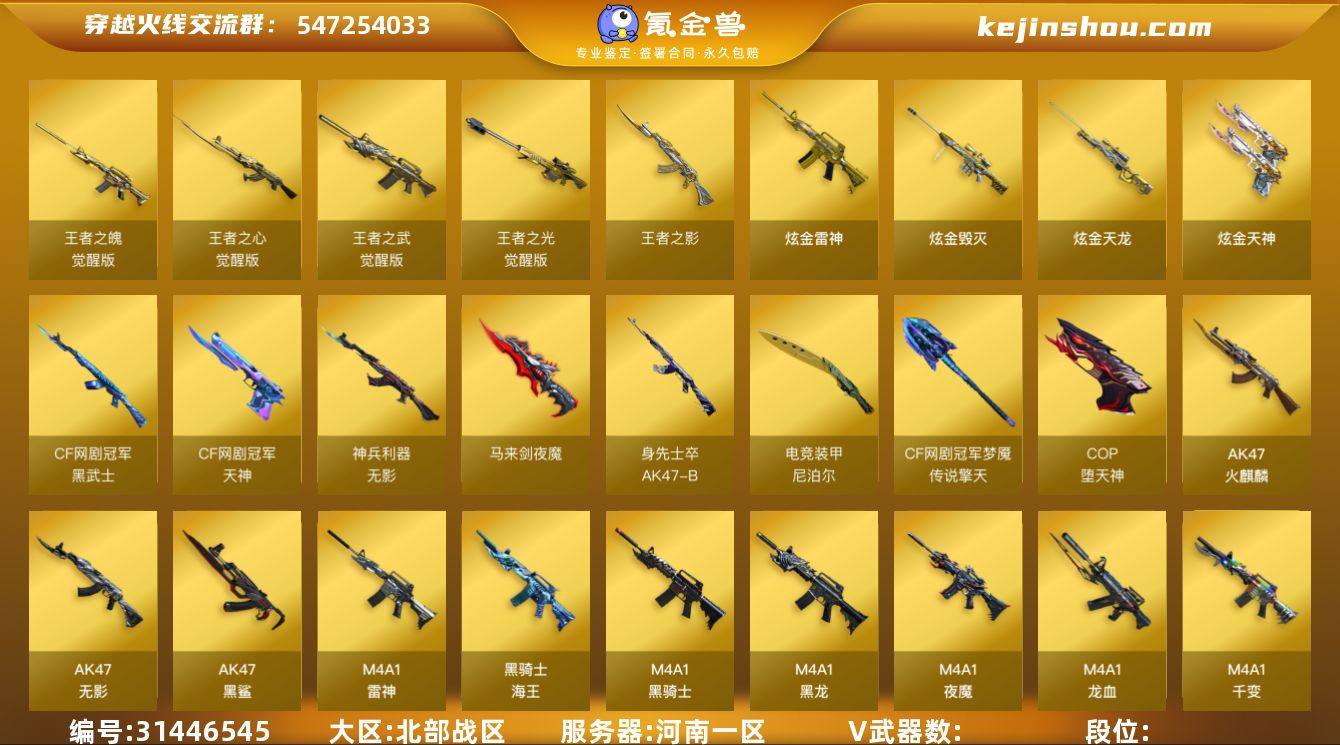 北部战区(河南一区)ys【精品爆破生化号】传说【传说光耀】146v【M200-幻神,夜魔套装,电竞装甲套装,动感闪耀套装,CF网剧冠军套装,ScarLight-白虎,QBZ03-金色蔷薇,HK417-朱雀,AWM-裁决,6烈龙+5炼狱+6修罗+死亡之眼+四防凌霄(全生化带生化背包变更)+沙漠玫瑰(带生化背包变更),COP-堕天神*2,破空枪刃-夜魔*3,柯尔特-电竞装甲,Colt1911-大黄蜂,QBZ03-吕布,猫猫手套】8王者【王者之心,王者之影,王者之魄,王者之武,王者之光】9炫金【炫金雷神,炫金骑士,炫金毁灭,炫金天龙,炫金天神】8角色【四防凌霄(全生化带生化背包变更),四防王者零-国色天香,沙漠玫瑰(带生化背包变更),迷迭香,樱,魅影,乔伊教练,王者玲珑,职业选手】4音效【M4A1-雷神音效卡,M4A1-黑骑士音效卡,AK47-火麒麟音效卡,Barrett-毁灭音效卡】45皮【雷神-烈虎,黑骑士-白马银枪,雷神-机甲刑天,毁灭-耀金,黑骑士-耀金,毁灭-星空,黑骑士-地狱火,雷神-宠儿,毁灭-战神张飞,无影-耀金,火麒麟-雷神,修罗-星空,毁灭-墨兰,火麒麟-心动糖果,火麒麟-平天大圣,火麒麟-CF STAR,天龙-CF STAR,千变-孔明,雷神-虎将,火麒麟-华夏之心,无影-霓棠,毁灭-黑大圣】挑战枪【暴君乱世-超越MAX,KAC-圣炎切割者III】VIP6 截图展示段位不代表实际段位 如赛季更新等不可抗拒因素发生变化、时限道具不保证所剩时间