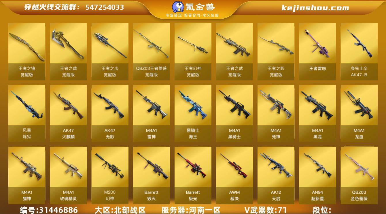北部战区(河南一区)【4.18w点券】71v【M200-幻神套+三皮(宠儿-2021MVP+周瑜+AG-CFPLS17冠军),王者幻神,竞技荣光套装,QBZ03-金色蔷薇,AWM-裁决,6修罗+6烈龙+斯泰尔-蝴蝶,柯尔特-竞技荣光,USP-雷暴,Colt1911-大黄蜂,QBZ03-吕布,金刚伞】8王者【王者幻神,QBZ-03-王者蔷薇,王者雷怒,王者之影,王者之武,王者之锋,王者之击,王者之啸】4角色【四防电竞教官-云悠悠,四防-葵-貂蝉,零,修道士,职业选手】6音效【M200-幻神音效卡,M4A1-黑骑士音效卡,Barrett-毁灭音效卡,Barrett-极光音效卡,N9-语音包,绝迹语音包】22皮【幻神-宠儿-2021MVP,幻神-AG-CFPLS17冠军,幻神-周瑜,黑骑士-白马银枪,雷神-烈虎,毁灭-风暴,雷神-宠儿-2019MVP,雷神-传奇N9,毁灭-CFS2018,毁灭-BEAN-2020MVP,毁灭-SV-CFPLS16冠军,毁灭-黑大圣】 截图展示段位不代表实际段位 如赛季更新等不可抗拒因素发生变化、时限道具不保证所剩时间