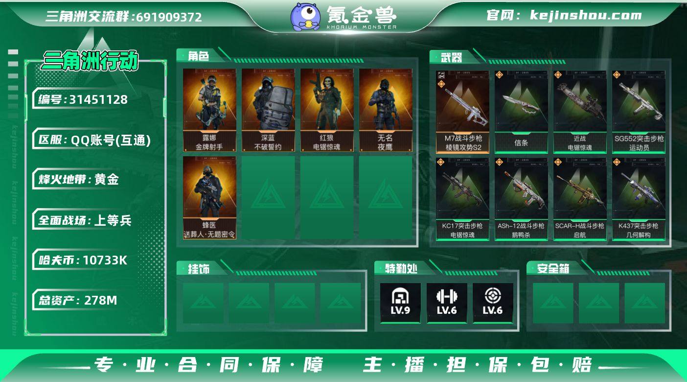 【店主推荐捡漏号】278m总资产-10733k哈伏币-60烽火等级-黄金-33战场等级-上等兵 【干员外观】:蜂医-送葬人·无题密令,无名-夜鹰,深蓝-不破誓约,红狼-电锯惊魂,露娜-金牌射手 【近战皮肤】:近战-电锯惊魂,近战-信条,近战-黑鹰 【典藏外观】:M7战斗步枪-棱镜攻势S2 【传说外观】:M4A1突击步枪-阿米娅,ASh-12战斗步枪-鹅鸭杀,M7战斗步枪-巳蛇,SG552突击步枪-运动员,AK-12突击步枪-夜鹰,AK-12突击步枪-特斯拉线圈,SCAR-H战斗步枪-启航,CAR-15突击步枪-阿米娅,腾龙突击步枪-捞点薯条,K437突击步枪-几何解构,KC17突击步枪-电锯惊魂,UZI冲锋枪-特斯拉线圈,SMG-45冲锋枪-骑士,SR-3M紧凑突击步枪-特斯拉线圈,勇士冲锋枪-能天使-午夜邮差,QCQ171冲锋枪-鹅鸭杀,S12K霰弹枪-电锯惊魂,725双管霰弹枪-送葬人-无题密令,M250通用机枪-骑士之心,QJB201轻机枪-鹅鸭杀,M14射手步枪-电锯惊魂,AWM狙击步枪-捞点薯条,93R-捞点薯条,复合弓-黑·天际线 【史诗外观】:M1014霰弹枪-潜袭者,ASh-12战斗步枪-碎冰行动,AKM突击步枪-林中猎手,QBZ95-1突击步枪-曙光,ASh-12战斗步枪-守夜人,ASh-12战斗步枪-无极限,AUG突击步枪-蝮蛇,M7战斗步枪-百步穿杨,SG552突击步枪-尖端治疗,SG552突击步枪-深海恐惧,SCAR-H战斗步枪-囚徒,G3战斗步枪-流沙送葬,AS Val突击步枪-尖端治疗,AS Val突击步枪-百步穿杨,腾龙突击步枪-无垢,腾龙突击步枪-猎鳄行动,K437突击步枪-守护者,MP5冲锋枪-战术竞备,Vector冲锋枪-阿萨拉文明,Vector冲锋枪-百步穿杨,SR-3M紧凑突击步枪-荒野求生,SR-3M紧凑突击步枪-战术竞备,勇士冲锋枪-深海恐惧,MP7冲锋枪-无垢,MP7冲锋枪-守护者,M1014霰弹枪-林中猎手,PKM通用机枪-守夜人,PKM通用机枪-荒野求生,M250通用机枪-囚徒,Mini-14射手步枪-守护者,SVD狙击步枪-荒野求生,S...