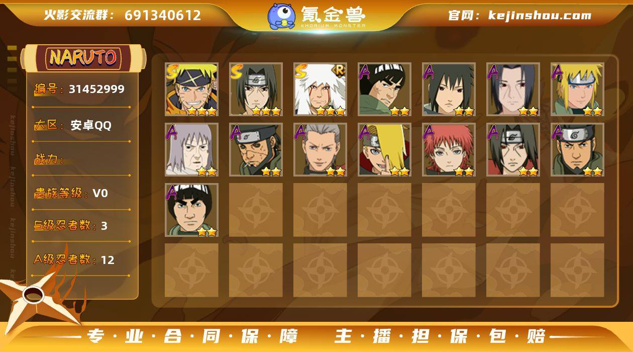 MHY3976【S忍者6 A忍者19 通灵14】【安卓Q-3320区-136级-V4-366万战力】【S级】自来也「舞之豪杰」 佩恩「天道」 宇智波鼬「须佐能乎」 波风水门 宇智波佐助「永恒万花筒」 漩涡鸣人·宇智波佐助【A级】小南「神驹佑将」 长十郎「六代目水影」 飞段「死司凭血」 蝎 日向宁次「忍界大战」 我爱罗「疾风传」 迈特凯「青春爆炸」 迪达拉「秽土转生」 干柿鬼鲛 千代「近松十人卫」 宇智波泉奈 李洛克「忍界大战」 宇智波鼬「夏日限定」 波风水门「青年」 秋道丁次「忍界大战」 宇智波佐助「须佐能乎」 桃地再不斩「秽土转生」 迈特凯 漩涡鸣人「九尾查克拉」【B级】漩涡鸣人「新春限定」 宇智波鼬「红夜之刃」 佐井「最终章」 君麻吕「咒印」 御手洗红豆「新春限定」 佩恩「畜生道」 勘九郎「疾风传」 君麻吕 御手洗红豆 山中井野「疾风传」 萨姆伊「新春限定」 旗木卡卡西「暗部」 漩涡鸣人「中秋限定」 大和 夕日红 宇智波带土「少年」 枫「新佩恩六道」 漩涡鸣人「疾风传」 君麻吕「漂泊浪客」 惠比寿 天天「疾风传」 春野樱「忍者少女」 鬼灯水月 春野樱「疾风传」 日向宁次「疾风传」 鬼灯满月「忍刀七人众」 天天「峨眉宗师」 木叶丸「疾风传」 野原琳「漂泊浪客」【C级】勘九郎 多由也 漩涡鸣人 奈良鹿丸 多由也「秽土转生」 并足雷同 水木「咒印」 油女志乃 秋道丁次 宇智波佐助 静音 伊豆野山葵 尤鲁伊 丸星古介 鬼童丸「秽土转生」 金槌 山中井野 手鞠 月光疾风 李洛克 手鞠「镰多利」 鬼童丸 日向雏田 春野樱 左近右近 漩涡鸣人「忍者学员」 海野伊鲁卡 宇智波佐助「写轮眼」 日向花火 犬塚牙 天天 次郎坊 山城青叶