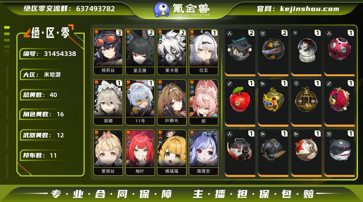 冒险等级:58 总黄数:40 五星角色数:16 菲林底片数量:0 菲林数量:585 加密母带数量:2 3命格莉丝,2命星见雅,2命莱卡恩,1命仪玄,1命丽娜,1命「11号」,0命叶瞬光,0命照,0命爱丽丝,0命柚叶,0命橘福福,0命薇薇安,0命耀嘉音,0命浅羽悠真,0命月城柳,0命珂蕾妲 6命潘引壶,6命波可娜,6命赛斯,6命露西,6命苍角,6命派派,6命比利,6命本,6命安比,6命妮可,6命安东,6命可琳,4命真斗 2精霰落星殿,2精硫磺石,1精云霓孤光,1精十方锻星,1精狸法七变化,1精福虓炉炉,1精青溟笼舍,1精玲珑妆匣,1精嵌合编译器,1精拘缚者,1精燃狱齿轮,1精深海访客 2精狮耶,2精罗宾,2精格列佛探员,1精阿饭,1精芽芽,1精比克布利克,1精艾丝弥小姐,1精咔嚓仔,1精阿崔巡查,1精鲨牙布,1精插头布 百里香之海,白心旧影,狡黠甜心,墨形影踪,晴空化狸,晴澜双迹套装,水晶灯下,漪光夜曲 卖家说:该账号为原神,崩铁,绝区零,崩坏三连体号,带米游社账号售卖,崩坏三88级,原神58级,崩铁70级,绝区零57级。原神up角色练度合格,特色角色:4+1雷神,0+1草神,1+2绫人,0+1恰斯卡;崩铁up角色练度合格,特色角色:0+1遐蝶,0+0白厄,2+1流萤,1+1阮梅,1+2灵砂,0+1景元;绝区零,主流配队齐全,练度优秀,除了艾莲的皮肤剩下都有,特色角色:2+2星见雅,1+1仪玄,0+1爱丽丝0+1橘福福,0+1柚叶,0+1耀嘉音,0+1叶瞬光;崩三三个爱莉希雅有专武爱愿妖精和粉色妖精小姐有专属圣痕,天命难逃德莉莎专武加专属圣痕,花火专武加专属圣痕。崩三原神和崩铁可咨询。