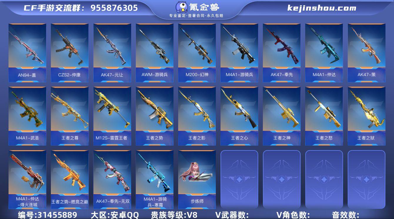 安卓Q☝贵族8☝心至尊☝怒至尊☝步练师☝王者之势-燃竞之巅☝AK47-奉先一无双☝AK47-元让☝M4A1-仲达-烽火连城☝M4A1-游骑兵一寒霜☝AK47一策一霸魂☝AWM一游骑兵☝王者之怒-冰霜奇迹☝M200一幻神一战舞☝王者之心☝王者之影☝王者之尊☝M4A1-武圣☝AN94-盖☝王者之神☝王者之狱☝M12S-雷霆王者☝CZS2-仲康☝王者之霆☝KSG-孟获☝详细见图☝