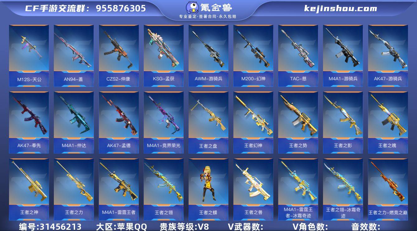 苹果Q☝可修改二次实名☝贵族8☝二至尊☝一同框☝魄至尊☝心至尊☝虹儿☝钟小魁☝王者之力一燃竞之巅☝王者幻神-燃竞之巅☝王者之翎-冰霜奇迹☝M4AI-雷霆王者-冰霜奇迹☝王者之魄-HeartShot☝王者之势-HeartShot☝AK47-孟德一过载☝AK47-奉先一无双☝M4A1-仲达☝M4A1-游骑兵-枪娘☝AWM-游骑兵-寒霜☝王者之兽-冰霜奇迹☝王者之影☝AN94-盖☝AK47-游骑兵☝M4A1-竟界荣光-蜂鸟☝MK47-鼓龙-白昼☝MK47-金角巨兽☝QBZ191-帝皇铠甲☝王者之神-冰霜奇迹☝TAC-慈☝M200-幻神☝98K-蜻蜓☝王者之盘☝王者之蝶☝CZS2-仲康☝M12S-天公☝KSG-孟获☝详细见图☝