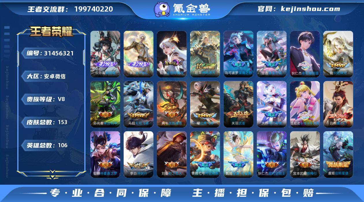 安卓微信区,贵族八,最强王者,英雄106,皮肤153,无双2,传说22,史诗51。无双限定:李白岁月剑心,公孙离离恨烟,传说限定:后羿神速通天,亚连落雪白狼,吕布曦玄,狄仁杰夜礼服假面,王昭君永恒水手月亮,甄姬至美化雀舞,大乔时之奇旅,鲁班七号时之奇旅,马可波罗深海之息,关羽武圣。史诗限定:周瑜线条小狗,公孙离涂山容容,西施织梦人,安琪拉成龙聚宝船,李元方匿光侦察者,妲己时之奇旅,芈月白晶晶,后羿辉光之辰,嬴政优雅恋人。狗年限定:后羿辉光之辰,虎年限定关羽武圣。小国敖隐战力1429,小国蒙犽战力13623,省标李白战力11468,省标孙尚香战力14407,省标司马懿战力10735,省标百里守约战力13513。市标公孙离战力8888,市标韩信战力8238。区标橘右京战力2541,区标裴擒虎战力1957,区标马可波罗战力5156,区标诸葛亮战力3690,区标亚连战力2441。发育路68段。诚心卖,诚心卖。
