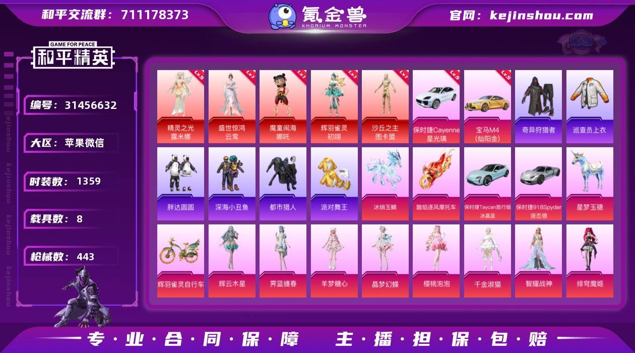 苹果 【极品神装号 宾利飞驰(皇家紫)(二级)/帕加尼imola(星空蓝)(一级)/保时捷Cayenne(星光璃)(一级)/灵驹仙姬-云歌(二级/暮色玫影-艾丽娅(一级)/精灵之光-露米娜(一级)/沙丘之主-图卡盟(六级)/雪国幻梦/梦幻火箭/浪漫天命/都市猎人/派对舞王/暗影哥特/甜心巧克力/洛天依/M416-女娲灵识(九级)】手Q-4神装-19粉装-27特效枪-6载具-19粉色飞行器-138212热力值-15王牌印记-189套装-278枪皮 【红色载具】:宾利飞驰(皇家紫)(二级),帕加尼imola(星空蓝)(一级),保时捷Cayenne(星光璃)(一级) 【红色神装等级】:灵驹仙姬-云歌(二级),暮色玫影-艾丽娅(一级),精灵之光-露米娜(一级),沙丘之主-图卡盟(六级) 【红色角色神装】:灵驹仙姬-云歌,暮色玫影-艾丽娅,精灵之光-露米娜,沙丘之主-图卡盟 【热门品类】:粉装-雪国幻梦,粉装-梦幻火箭,套装-浪漫天命,套装-都市猎人,套装-派对舞王,套装-小丑鱼,套装-胖达团团,套装-龟仙人,套装-暗影哥特 【粉色套装】:粉装-甜心巧克力,粉装-宝贝奶油派,粉装-天使彩虹糖,粉装-雪国幻梦,粉装-梦幻火箭,粉装-智能音符,粉装-放客神游,粉装-山涧鹿灵,角色-洛天依,角色-2号机款机体服,粉装-炫光之旅,角色-小叽联名款,角色-光极星,角色-千金淑猫,粉装-幻彩电音,角色-狂魅哈莉,角色-羊梦糖心,角色-虹云熊熊 【粉色枪皮等级】:AKM-甜心宝贝(一级),AKM-魔法神域(一级),AKM-暮色玫影(三级),SCAR-L-纯梦嫁纱(一级),SCAR-L-魔童闹海 哪吒(三级),M416-风花雪月(一级),M416-至情至圣(一级),M416-超新星(一级),M416-墨龙九天(一级),M416-女娲灵识(九级),M416-灵猫魔法师(一级),GROZA-焦糖拿铁(一级),GROZA-精灵之光(三级),AUG-超新星(一级),AUG-星梦奇缘(三级),UMP45-玉魂晶魄(七级),P90-沙丘之主(三级),Kar98K-巳巳如意(五级),Mk14-盛世...