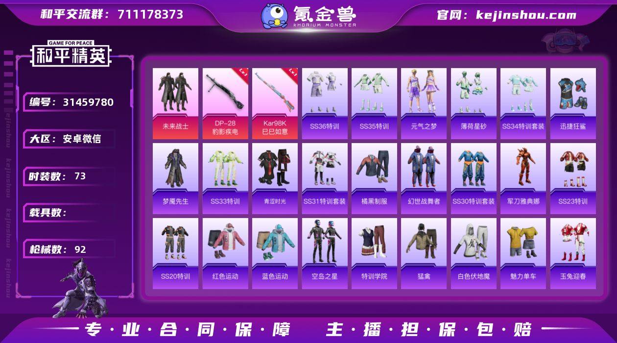 可二次实名【迅捷狂鲨2特效枪1粉装 V社交 游戏正常】 安卓V区-24771热力值-1印记-73套装-92枪皮 【1粉装】 未来战士【2特效枪】 Kar98K-巳巳如意(4级) DP-28-豹影疾电(5级)【76热门】 梦魇先生 迅捷狂鲨 军刀雅典娜 白色伏地魔 SS27特训 SS26特训 SS25特训 SS24特训 SS23特训 SCAR-L-玉兔迎春 GROZA-2B战斗服款 Mk47-乌木金纹 SKS-糯团青竹 UMP45-蓝色火焰 M249-彩虹符号 MG3-幻世战舞者 M416-蓝色火焰 长空猛禽 特训学院 青涩时光 霓虹街区 魅力单车 蓝色运动 橘黑制服 漫步者 红色运动 纯真浪花 MG-36-薄荷星砂 SS34特训 大橘大利 SS20特训 SS21特训 SS30特训 ACE32-冰晶雪宝 SS28特训 海盐绵绵冰 SS31特训 SS33特训 SS32特训 巳巳如意 蜜獾-精灵梦叶罗丽 焰鹰斗篷 SS36特训 热情海星 湖雨初晴 玩偶服-卖崽青蛙 战术大师 银尘 短管霰弹-星穹咏叹调 大砍刀-黑金刀 Kar98K-彩虹符号 撬棍-幻世战舞者 MG3-乌木金纹 AKM-涂鸦街区 烟雾弹-冰氧夏日 SS35特训 薄荷星砂 元气之梦 AUG-异域银装 信号枪-异瞳寒姬 SLR-霓彩脉冲 UMP45-极意拳锋 沙漠之鹰-快闪甜心 平底锅-空岛之星 平底锅-焰鹰斗篷 P90-巳巳如意 平底锅-快闪甜心 平底锅-惊鸿侠骨 SCAR-L-海盐豹豹 破片手榴弹-呆爆全场 QBZ-纯真浪花 AWM-纯真浪花 元素星魂 汤姆逊-纯真浪花 AA12-G-纯真浪花 平底锅-纯真浪花【1飞行器】 火焰蝠人飞行服【13背包】 快闪甜心背包(3级) 猪猪侠背包(3级) 焰鹰斗篷背包(3级) 2P战斗服款背包(3级) 夜幕颂歌背包(3级) 精灵梦叶罗丽背包(3级) 冰河战士背包(3级) 智谋强哥背包(3级) 仲夏莫吉托背包(3级) 狂鲨锋刃背包(3级) 霓虹街区背包(3级) 龙的传人背包(3级) 闲梦青缨背包(3级) 营地ID:961748379