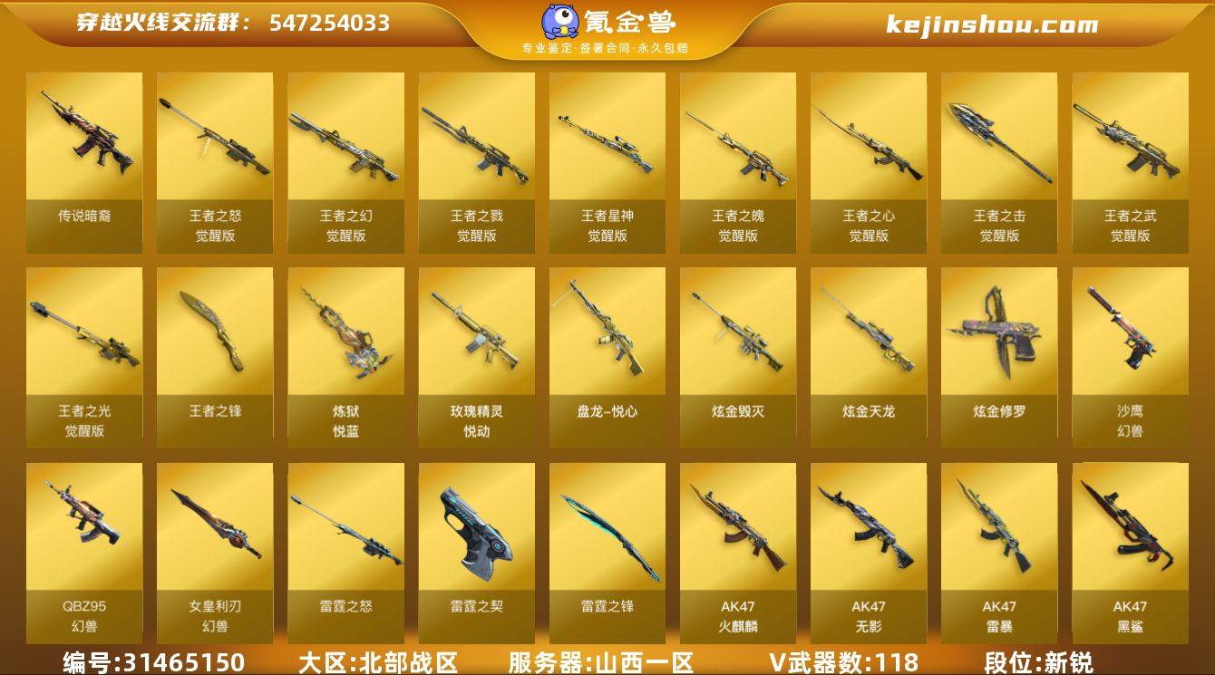 上海二区-73V-9王者-2炫金 【热门武器】:QBZ03-金色蔷薇,M200-幻神,金色蔷薇-古蛇迷踪,修罗-古蛇迷踪,M200-竞技荣光,死亡之眼,Kar98K-星神,炼狱-迷你小钢,汤姆逊-烈龙*6,RPK-盘龙*6,COP-堕天神*2,沙鹰-修罗*3,炽芒蝶刃,金刚伞 【王者炫金武器】:炫金雷神,炫金超新星 【音效卡】:M200-幻神音效卡,AK47-火麒麟音效卡,M4A1-雷神音效卡,Barrett-毁灭音效卡,Kar98K-星神音效卡,火线妹语音包 【皮肤】:M200-幻神-黄忠皮肤,雷神-暗月,M4A1-战神赵云,雷神-源计划2.0专属 皮肤,火麒麟-轻羽皮肤,火麒麟-心动糖果,毁灭-暗月,毁灭-直播专属 【角色】:迷迭香,王者樱-热浪之夏,王者影豹,蛇隐宗,奇洋探员,暗夜-X,飞虎队-X,嘉年华灵狐,灵狐者-黄金海岸,曼陀罗-X,曼陀罗-礼服,女主播,潘多拉-甜心教官,青霞仙子,蛇姬,斯沃特-X,铁骑荣耀,新娜塔莎,游珑儿 【人偶武器】:炼狱-迷你小钢,巴雷特-零-水下丽影,AWM-灵狐-15周年嘉年华,迷你波特博士*4,迷你火种,迷你生化手雷*2,生化手雷-机甲核心*2 【暴走生化】:死亡之眼 【挑战大师】:试炼破坏者III,神圣爆裂者-末日III 【英雄级武器】:AK47-火麒麟,M4A1-雷神,M4A1-堕天神,QBZ03-天罚,无影-神兵利器,黑武士-锦绣游龙,超新星-热带奇洋,金色蔷薇-古蛇迷踪,QBZ03-金色蔷薇,王者之势-觉醒版,黑骑士-海王,白虎之魄-觉醒版,Barrett-毁灭,AWM-裁决,M200-幻神,Kar98K-星神,M200-竞技荣光,RPK-盘龙*6,汤姆逊-烈龙*6,AA-12-雷霆,沙鹰-修罗*3,沙鹰-天神*3,COP-堕天神*2,修罗-古蛇迷踪,屠龙,麒麟刺-堕天神,炽芒蝶刃,龙啸-热带奇洋,龙啸-堕天神*2,高爆手雷-堕天神*7,高爆手雷-神工天巧,高爆手雷-云龙,手雷-热带奇洋,高爆手雷-古蛇迷踪,闪光弹-堕天神*7,闪光弹-神工天巧,闪光弹-云龙,闪光弹-雷霆王者-...