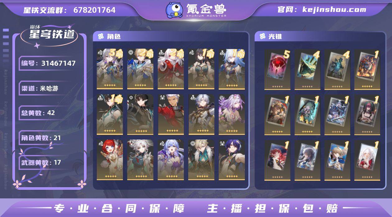 一手账号。追击队完整:飞霄,托帕,知更鸟,砂金。有白厄和遐蝶两位大c,卡芙卡,缇宝,阮·梅,罗刹等五星。另有专光:云璃,托帕,藿藿,卡芙卡。 地图未开采资源较多,可挖掘星琼多;号上还有一发十连。价格不满意可商量。