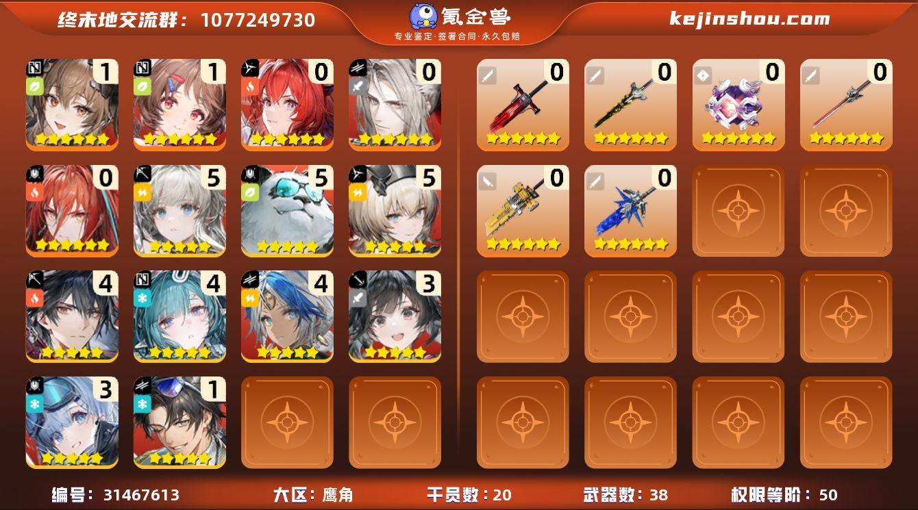 账号很欧,50权限等级,6个6星角色:莱万汀0潜,洁尔佩塔1潜,艾尔黛拉1潜,骏卫0潜,余烬0潜。武器熔铸火焰,不知归,沧溟星梦,宏愿,昔日精品,三个六星武器箱子