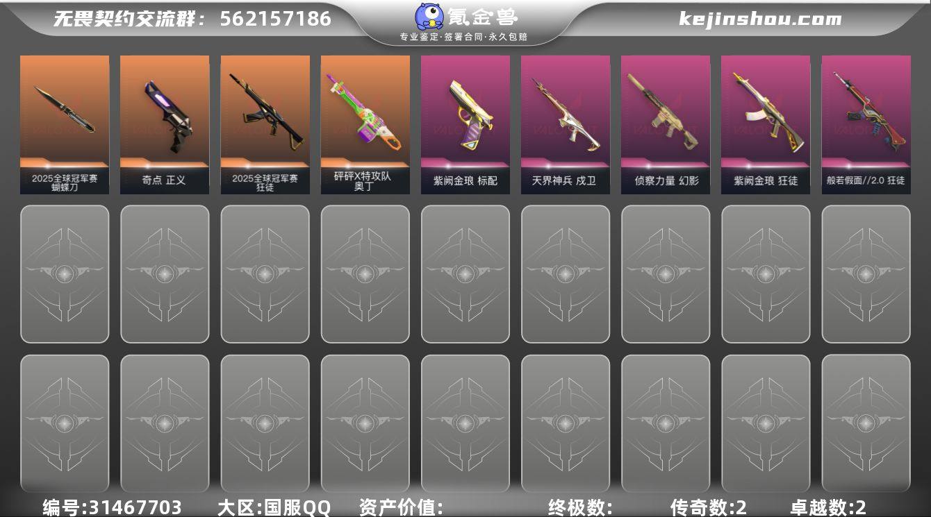 【编号58021 可秒换绑】【店长推荐精氪毕业号!显卡爪+剥皮小刀+猫猫AK!!!!】 【套装】:光荣异象套装 【英雄】:幻棱,炼狱,暮蝶,壹决,铁臂,捷风,雷兹,幽影,不死鸟,贤者,猎枭,蝰蛇,芮娜,尚勃勒,霓虹,斯凯,夜露,K/O,盖可 【近战武器】:近战武器-碎心裂刃,近战武器-ORA x 颗秒 军刀,近战武器-光荣异象 歧途,近战武器-剥皮小刀,近战武器-RGX 11z Pro//3.0 爪刀,近战武器-诡秘蛇影 军刀,近战武器-日耀风暴 遗器 【狂徒】:狂徒-2025全球冠军赛,狂徒-混沌序曲,狂徒-光荣异象,狂徒-艾沃莉的梦之翼,狂徒-盖亚的复仇,狂徒-诡秘蛇影 【幻影】:幻影-洪荒怒焰,幻影-紫阙金琅//2.0,幻影-末日之翼 【戍卫】:戍卫-折光棱晶 【冥驹】:冥驹-光荣异象 【飞将】:飞将-末日之翼 【莽侠】:莽侠-诡秘蛇影 【奥丁】:奥丁-末日之翼 【判官】:判官-光荣异象,判官-诡秘蛇影 【蜂刺】:蜂刺-折光棱晶 【标配】:标配-光荣异象,标配-折光棱晶 【正义】:正义-奇点,正义-游戏结束 【鬼魅】:鬼魅-奇点//2.0,鬼魅-诡秘蛇影 【短炮】:短炮-末日之翼 【卡面】:无畏契约GO!第一卷:芮娜 卡面,无畏契约GO!第一卷:零 卡面,代号红色 卡面,新兵报到 卡面,V契约 卡面,无畏契约 卡面 【喷漆】:买装还是存钱 喷漆,胜利属于无畏契约 喷漆,GLHF 喷漆,无畏契约 喷漆 【挂饰】:天外飞客 挂饰,无畏契约 纪念币 挂饰