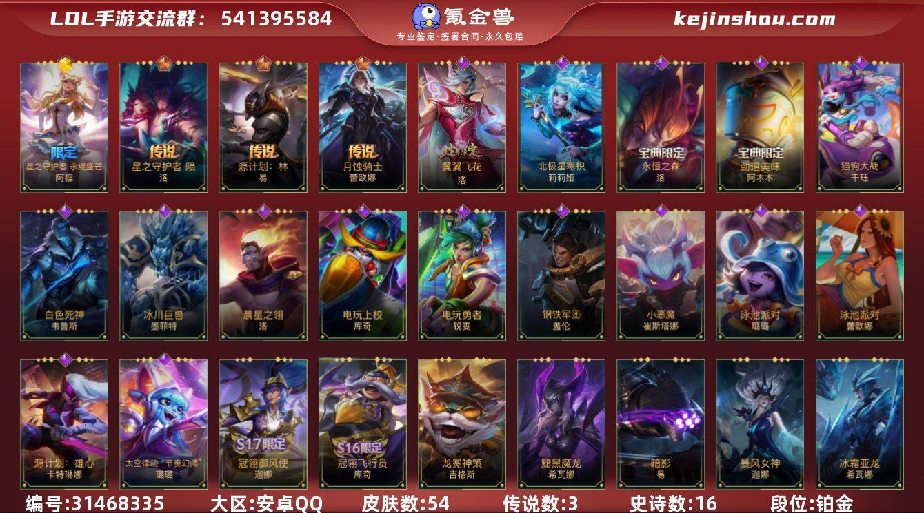 皮肤数:54 典藏皮肤数量:0 神话皮肤数量:1 传说皮肤数量:3 史诗皮肤数量:16 星之守护者阿狸永绽盛芒 段位:铂金