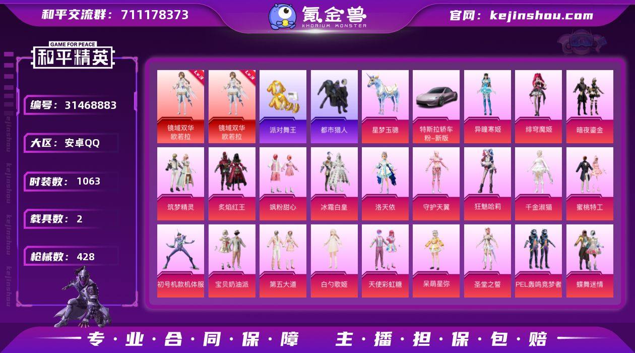 实名:可二次实名 是否支持人脸包赔:不支持 粉装数量:22 特效枪数量:25 载具数:2 时装数:1063 枪械数:428 都市猎人,派对舞王 三级镜域双华-欧若拉 异瞳寒姬,暗夜鎏金,宝贝奶油派,冰霜白皇,白勺歌姬,初号机款机体服,炙焰红王,呆萌星弥,第五大道,蝶舞迷情,绯穹魔姬,狂魅哈莉,洛天依,蜜桃特工,PEL轰鸣竞梦者,千金淑猫,启明星,飒粉甜心,守护天翼,天使彩虹糖,圣堂之誓,筑梦精灵 七级AUG-南国舞曲,七级GROZA-焦糖拿铁,七级破片手榴弹-美味星星糖,六级AKM-甜心宝贝,六级SCAR-L-童趣迷兔,六级Vector-灵感创作师,五级AKS-74U-森灵之息,五级DP-28-豹影疾电,五级MG-36-沧焰双生,五级AKM-绿萝繁花,五级AKS-74U-信仰神谕,五级Kar98K-巳巳如意,五级M416-心之恋语,五级M762-激战未来,五级MG3-洛神天依,五级Mk14-精灵梦叶罗丽,五级P90-粉樱探戈,五级UMP45-相思残雪,五级烟雾弹-猫咪绅士,四级DP-28-千金淑猫,四级M417-第五大道,三级AKM-炫紫旋律,二级MK14-樱桃泡泡,一级DP-28-暗夜鎏金,一级MG3-酷泡奶龙 特斯拉Roadster(沁心粉),星梦玉骢 福马献瑞,红釉青花,SS37特训,玲珑侠影,青翼流星,雪国风尚,画境星梦,琴音绮想,书海巡游,SS36特训,炫彩糖果,绯色魅影,萌鸡速递,风迹短诗,秘语星愿,SS35特训,午间小调,元气之梦,漫游都市,薄荷星砂,云魄琉璃,狂鲨锋刃,凌霄紫焰,SS34特训套装,游乐,朱霞炽焰,艾菲玫瑰,暗黑裁决,暗夜风云,暗影哥特,暗夜契约,冰川特警,冰冻风暴,缤纷果语,暴风机械师,北国孤狼,白光莹,冰公主,滨海厨神,冰河战士,白兰地假日,白色伏地魔,贝斯之夜,半糖蓝莓,白熊同盟,冰原使者,纯白誓言,纯白跃动,春光漫游,雏菊兔兔,长空猛禽,丛林猎人,苍岚星,潮流游乐家,传奇侦探,春日漫步,创世·幻影,春野茶蘼,初雨海棠,炽焰拳师,纯真浪花,顶瓜瓜,蝶变,都市丽猫,都市猎人,蝶吟花词,电音精灵,风暴特警,飞驰魅影,风玲,绯格组合,粉红小猪,疯狂小兔子,粉日山川,福星高照,飞行日记,格斗先锋,格斗专家,龟仙人,刚毅裁决者,光之冒险,幻彩翩翩,海岛探路者,虎虎生威吉莉,和平特警,荷畔雨呱,幻世保卫者,黄色运动,幻世战舞者,和煦暖阳,幻羽潜行,黑曜寓言,金戈铁马,晶辉守护,惊鸿侠骨,娇憨猪猪,击剑大师,竞技名士,竞技勇士朋克,吉莉礼服,晶灵使者,激萌罗小黑,坚韧舞者,极速竞梦,精神漫游,决胜时刻,街头风暴,军械专家,锦衣飞扬,酷潮明星,空岛之星,狂花道·雅典娜,科技之星,快闪甜心,狂沙舞者,蓝调潮人,龙的传人,凛冬战士,龙宫之主,龙魂突击队,猎鹰,冷酷挑战者,萝兰蝴蝶,黎明保卫者,猎梦纪元,灵蜜圈圈,浪漫天命,浪漫樱花,蓝调潮影,龙腾端午,莱茵河畔,漫步者,摩登魅猫,妙红点点,棉花软糖,萌黄之夏,魔力冰咖,魅力单车,果汁能量,麻辣教官,懵萌河马,曼妙人鱼,梦起落英,萌趣咩咩,明日香款战斗服,蜜桃派对,明鸳圣池,迷域探索者,卖崽青蛙,暖风夏荷,逆风勇士,霓虹极客,霓虹街区,怒火燎原,柠萌假日,牛气冲天,浓情蜜辣,牛气满满,暖心熊熊,派对舞王,破蛋小黄鸡,轻风白浪,情公主,拳皇97八神庵,青涩时光,青团波波,千禧之恋,青玉碎影,云朵鹅,瑞龙福将,荣耀,热情海星,人鱼之吻,赛博空间,圣诞大吉,深蓝冒险家,森林游猎者,沙漠兵团,神秘黑猫,神秘领域,神气柴柴,帅气教官,SS11特训,SS12特训,SS13特训,SS14特训,SS