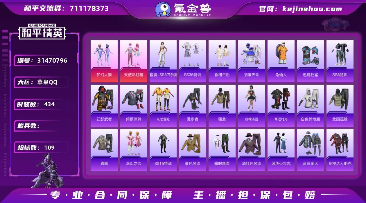 实名:不可二次实名 是否支持人脸包赔:不支持 粉装数量:2 时装数:434 枪械数:109 梦幻火箭,天使彩虹糖 SS37特训,SS36特训,冰川特警,缤纷果语,缤纷假日,北国孤狼,滨海假日,白糯汤圆,白色伏地魔,冰爽海盐,白熊同盟,白月香洋装,纯白誓言,长空猛禽,超能勇士,都市魅力,风暴特警,风华少年志,飞行日记,格斗先锋,龟仙人,光之冒险,幻彩翩翩,湖蓝色名流,黑色伏地魔,黄色伏地魔,黄色名流,黄色运动,红色运动,幻影武者,酒红色名流,橘黑制服,娇憨猪猪,竞技达人朋克,竞技名士,极速红龙,街头潮人,酷潮明星,空岛之星,科技之星,狂沙舞者,蓝彩潮人,猎鹰,黎明保卫者,浪漫天命,浪漫樱花,蓝色运动,冷焰舞者,漫步者,猛禽,妙红点点,萌黄之夏,魅力单车,萌趣咩咩,萌趣颜团子,霓虹街区,柠萌假日,牛气冲天,牛气满满,破蛋小黄鸡,破晓战魂,轻风白浪,绮丽涂鸦,青年教官,青涩时光,千禧之恋,人气偶像,深蓝色名流,SS10特训,SS11特训,SS12特训,SS13特训,SS14特训,SS15特训,SS17特训,SS19特训,SS21特训,SS22特训,SS23特训,SS24特训,SS25特训,SS26特训,SS27特训,SS8特训,SS9特训,甜蜜熊情侣,涂山之恋,特训学院,田园牧歌,完美偶像,迅捷狂鲨,炫蓝之夏,夏日音浪,香榭午后,耀粉歌者,玉兔迎春,耀眼新星,战地督导,灼焰舞者,治愈之星 神秘黑猫飞行器,彩虹甜喵降落伞,夏日绵绵冰降落伞,筑梦精灵降落伞,仲夏莫吉托降落伞 卖家说:梦幻火箭 特训黑紧身衣 浪漫天命 狂沙舞者 精氪小身法