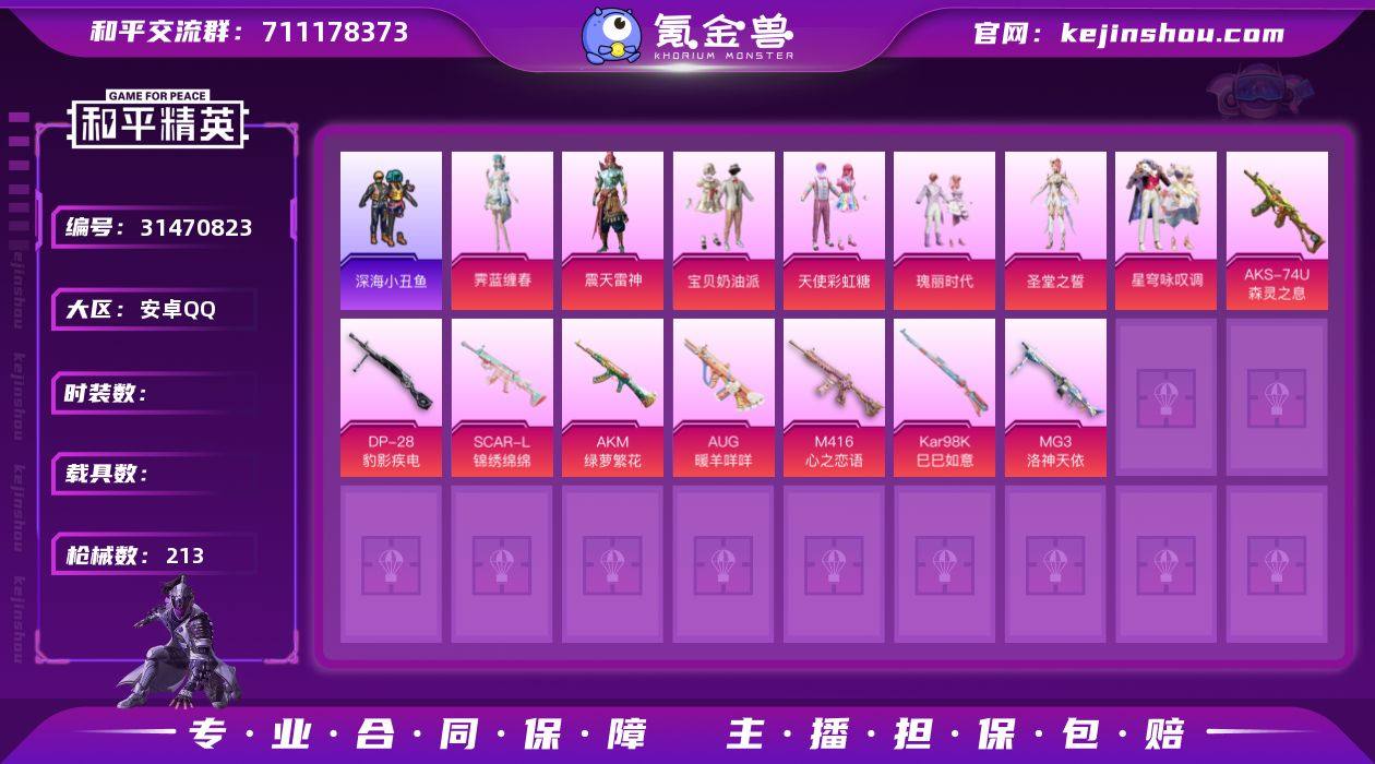 【0载具 8特效枪 7粉装 213枪皮 160套装】满级心之恋语 7王牌1卓越1传奇 6万热力值 深海小丑鱼,套宝贝奶油派,套天使彩虹糖,瑰丽时代,圣堂之誓,套老实芭蕉,-霁蓝缠春,星穹咏叹调,震天雷神 SCAR-L-锦绣绵绵,AKM-绿萝繁花,AUG-暖羊咩咩,M416-心之恋语,Kar98K-巳巳如意,AKS-74U-森灵之息,MG3-洛神天依,DP-28-豹影疾电 t5-3 df78-01,编号:WPKQN83