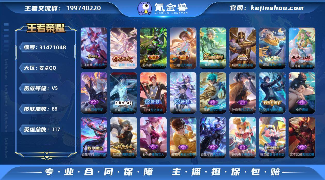 安卓Q-V5-至尊星耀III段位-117英雄-88皮肤-5传说-26史诗【英雄全皮】:影全皮【传说皮肤】:虞姬愿照岁时盈,云缨幻光神枪,桑启鸣野蒿,后羿黄金射手座,孙尚香末日机甲未来机甲【限定皮肤】:蒙犽顽岩魄,蔡文姬夏日便利店,虞姬夏日便利店,姜子牙天穹之誓,狄仁杰阴阳师,赵云皇家上将,孙尚香蔷薇恋人,项羽海滩派对,张良古海寻踪,沈梦溪龙舞盛年,刘邦剑破天穹,周瑜熔金海岸【年限皮肤】:虞姬愿照岁时盈【赛季限定】:张良古海寻踪,刘邦剑破天穹,姜子牙天穹之誓,东皇太一噬灭天穹,太乙真人谧流熔炉,钟馗虚灵犬护,甄姬逆浪荇歌【战令限定】:蔡文姬夏日便利店,虞姬夏日便利店,亚连破空之剑,孙悟空神迹守卫,百里守约百相守梦,老夫子百相守梦,周瑜线条小狗【史诗皮肤】:赵云皇家上将,貂蝉圣诞恋歌,宫本武藏鬼剑武藏,孙尚香蔷薇恋人,孙尚香水果甜心,嬴政摇滚巨星,妲己魅力维加斯,吕布圣诞狂欢,诸葛亮黄金分割率,百里守约特工魅影,铠曙光守护者,李元芳逐浪之夏,程咬金功夫厨神,伽罗箭羽风息,狄仁杰鹰眼统帅,小乔青蛇,孙尚香时之恋人,蔡文姬夏日便利店,蒙犽顽岩魄,亚连破空之剑,百里守约百相守梦,阿轲化蝶舞,狂铁龙之律动,后羿石田雨龙,黄忠百相守梦,公孙离涂山容容,周瑜线条小狗【其他皮肤】:项羽海滩派对,韩信教廷特使,韩信街头霸王,露娜哥特玫瑰,赵云白执事,赵云忍炎影,亚瑟死亡骑士,花木兰兔女郎,宫本武藏万象初新,后羿阿尔法小队,狄仁杰阴阳师,小乔丁香结,鲁班七号黑桃队长,鲁班大师乓乓大师,蒙恬蔚蓝守将,戈娅危途狂花,太乙真人劲辣红锅,张良古海寻踪,沈梦溪龙舞盛年,刘邦剑破天穹,姜子牙天穹之誓,周瑜熔金海岸,虞姬夏日便利店,孙悟空神迹守卫,盘古敬我三分,东皇太一噬灭天穹,老夫子百相守梦,吕布逐霄战戟,苍苍林狼骑,太乙真人谧...