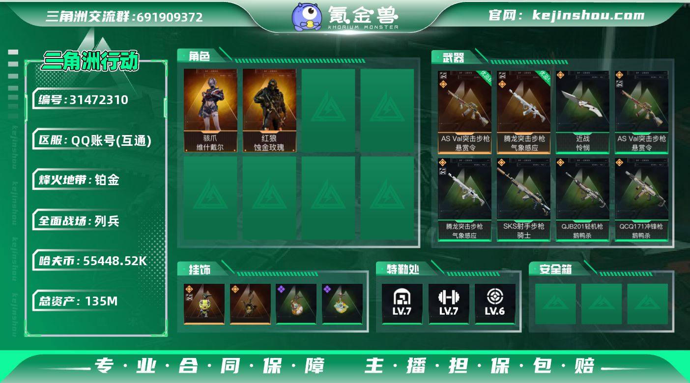 实名:可二次实名 总资产:135M 哈夫币:55448.52K 烽火地带段位:铂金 烽火地带等级:60 全面战场段位:列兵 全面战场等级:16 7级仓库,7级训练中心,6级靶场,3级指挥中心,0级潜水中心,3级防具台,3级工作台,3级制药台,3级技术中心,0级收藏室 战术部门等级:3 战斗部门等级:2 医疗部门等级:3 研发部门等级:2 后勤部门等级:2 曼德尔砖-气象感应:0 曼德尔砖-命运王牌:0 曼德尔砖-电玩高手:0 曼德尔砖-美杜莎:0