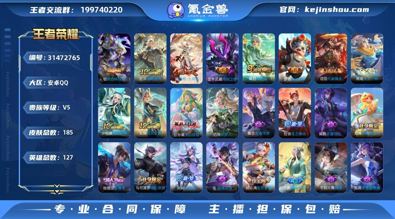 安卓Q-V5-最强王者段位-127英雄-185皮肤-1典藏皮肤-5传说-52史诗 【英雄全皮】:苍全皮,影全皮 【荣耀典藏】:铠银白咏叹调 【传说皮肤】:后羿神树通天,澜愿照九州拓,桑启鸣野蒿,梦奇胖达荣荣,宫本武藏地狱之眼 【限定皮肤】:姜子牙天穹之誓,狄仁杰阴阳师,赵云皇家上将,孙尚香蔷薇恋人,元歌无心,马可波罗暗影游猎,项羽海滩派对,孙悟空至尊宝,李元芳云中旅人,百里玄策原初追逐者,沈梦溪大漠名商,裴擒虎李小龙,裴擒虎擒涛扼浪,云中君纤云弄巧,鲁班大师探海日志,桑启海盐诗旅,阿古朵江河有灵,张良古海寻踪,鬼谷子天穹祈灯,姬小满妄想食味,沈梦溪龙舞盛年,刘邦剑破天穹,程咬金群星魔术团 【年限皮肤】:澜愿照九州拓 【赛季限定】:沈梦溪大漠名商,李元芳云中旅人,桑启海盐诗旅,裴擒虎擒涛扼浪,鲁班大师探海日志,张良古海寻踪,鬼谷子天穹祈灯,刘邦剑破天穹,姜子牙天穹之誓,东皇太一噬灭天穹,太乙真人谧流熔炉,钟馗虚灵犬护,甄姬逆浪荇歌,亚瑟荣光之誓,百里玄策原初追逐者,牛魔星界战将,项羽九幽镇关 【战令限定】:马可波罗暗影游猎,百里守约百相守梦,老夫子百相守梦,孙膑茶境仙,马超访茗客,刘禅鸭鸭历险记,沈梦溪鸭鸭历险记,周瑜线条小狗 【史诗皮肤】:露娜紫霞仙子,赵云皇家上将,赵云未来纪元,貂蝉圣诞恋歌,甄姬冰雪圆舞曲,王昭君偶像歌手,宫本武藏鬼剑武藏,孙尚香蔷薇恋人,孙尚香水果甜心,嬴政摇滚巨星,妲己魅力维加斯,妲己女仆咖啡,墨子金属风暴,吕布末日机甲,张飞乱世虎臣,孙悟空至尊宝,花木兰水晶猎龙者,刘邦德古拉伯爵,兰陵王暗隐猎兽者,亚瑟心灵战警,李元芳逐浪之夏,程咬金功夫厨神,白起星夜王子,孙策猫狗日记,伽罗箭羽风息,狄仁杰鹰眼统帅,不知火舞魅语,马可波罗暗影游猎,百里玄策原初追逐者,裴擒虎李小龙,云中君纤云弄...
