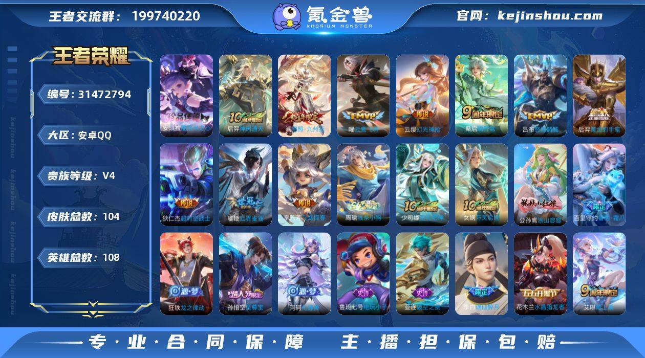 安卓Q-V4-永恒钻石III段位-108英雄-104皮肤-1珍品传说-10传说-32史诗 【珍品传说】:安琪拉酷洛米之心 【传说皮肤】:后羿神树通天,澜愿照九州拓,云缨幻光神枪,桑启鸣野蒿,吕布怒海麟威,李元芳飞鸢探春,曜云鹰飞将,虞姬云霓雀翎,后羿黄金射手座,狄仁杰超时空战士 【限定皮肤】:姜子牙天穹之誓,李白谪仙醉月,狄仁杰阴阳师,赵云皇家上将,孙尚香蔷薇恋人,狄仁杰魔术师,项羽海滩派对,孙悟空至尊宝,鲁班大师探海日志,张良古海寻踪,鬼谷子天穹祈灯,沈梦溪龙舞盛年 【年限皮肤】:澜愿照九州拓 【赛季限定】:鲁班大师探海日志,张良古海寻踪,鬼谷子天穹祈灯,姜子牙天穹之誓,东皇太一噬灭天穹,太乙真人谧流熔炉,钟馗虚灵犬护,亚瑟荣光之誓 【战令限定】:亚连破空之剑,孙悟空神迹守卫,百里守约百相守梦,老夫子百相守梦,周瑜线条小狗 【史诗皮肤】:鲁班七号电玩小子,赵云皇家上将,王昭君偶像歌手,狄仁杰魔术师,宫本武藏鬼剑武藏,孙尚香蔷薇恋人,孙尚香水果甜心,墨子金属风暴,刘禅绅士熊喵,曹操幽灵船长,张飞乱世虎臣,孙悟空至尊宝,花木兰水晶猎龙者,兰陵王暗隐猎兽者,诸葛亮黄金分割率,雅典娜冰冠公主,百里守约特工魅影,刘禅天才门将,程咬金功夫厨神,孙策猫狗日记,狄仁杰鹰眼统帅,杨戬天秀启明,亚连破空之剑,李白谪仙醉月,艾琳陌上桑,百里守约百相守梦,阿轲化蝶舞,狂铁龙之律动,百里守约雪豹霜爪,公孙离涂山容容,女娲万灵启世,少司缘巫礼祀神,周瑜线条小狗 【其他皮肤】:项羽海滩派对,韩信教廷特使,韩信街头霸王,赵云白执事,赵云忍炎影,安琪拉玩偶对对碰,妲己少女阿狸,达摩拳王,刘备万事如意,后羿阿尔法小队,狄仁杰阴阳师,刘备汉昭烈帝,关羽龙腾万里,狂铁命运角斗场,孙尚香沉稳之力,大乔守护之力,小乔丁香结,鲁班七号黑桃队长,狂铁特...
