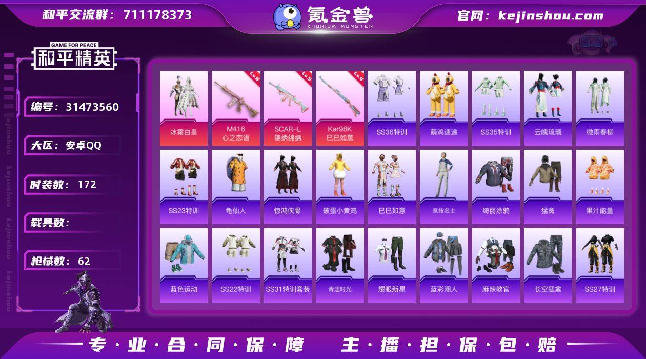 实名:可二次实名 是否支持人脸包赔:支持 粉装数量:1 特效枪数量:3 时装数:172 枪械数:62 冰霜白皇 六级M416-心之恋语,五级SCAR-L-锦绣绵绵,四级Kar98K-巳巳如意 SS36特训,萌鸡速递,SS35特训,云魄琉璃,冰川特警,长空猛禽,创世·幻影,风暴特警,龟仙人,幻世战舞者,惊鸿侠骨,竞技名士,锦衣飞扬,空岛之星,蓝彩潮人,龙的传人,蓝色运动,猛禽,魅力单车,果汁能量,麻辣教官,霓虹街区,牛气冲天,破蛋小黄鸡,绮丽涂鸦,青涩时光,SS20特训,SS21特训,SS22特训,SS23特训,SS24特训,SS25特训,SS26特训,SS27特训,SS31特训套装,SS32特训套装,巳巳如意,微雨春柳,玉兔迎春,耀眼新星 炫彩糖果降落伞,炫光之旅降落伞 卖家说:连体号不止这点