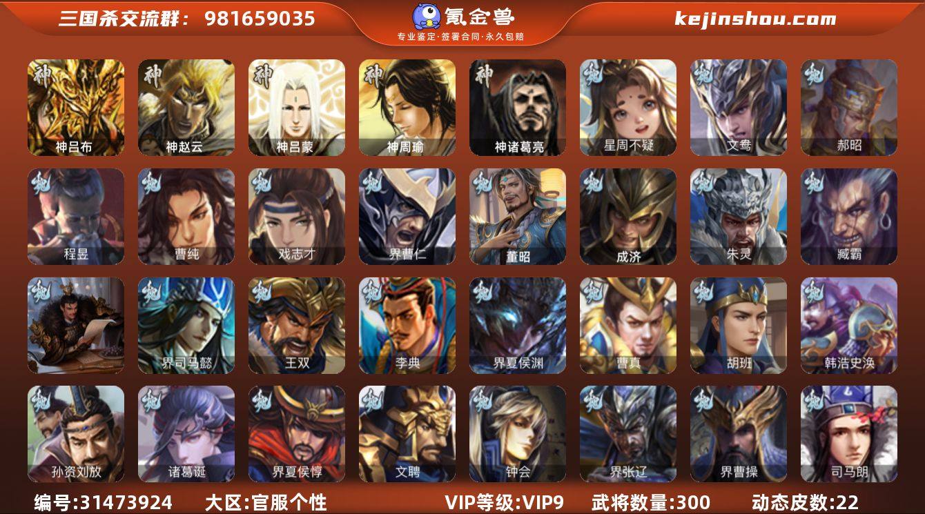 VIP等级: VIP9 官阶: 骠骑将军 武将数量: 300 动态皮肤数量: 22 神将: 神吕布,神赵云,神吕蒙,神周瑜,神诸葛亮 魏国武将: 戏志才,曹纯,程昱,郝昭,文鸯,唐咨-魏,张辽,SP蔡文姬,SP曹仁,SP关羽,SP贾诩,SP姜维,卞夫人,蔡贞姬,曹昂,曹操,曹冲,曹洪,曹丕,曹仁,曹叡,王异,鲁芝,曹休,界曹植,满宠,荀攸,王基,钟繇,郭嘉,荀彧,杜畿,界郭嘉,崔琰,界曹丕,界荀彧,朱灵,吕虔,界王异,界许褚,华歆,陈群,界邓艾,乐进,辛宪英,郭淮,界曹彰,郭皇后,夏侯惇,曹植,司马朗,谋于禁,界曹操,星周不疑,许褚,界张辽,张郃,钟会,文聘,曹彰,界夏侯惇,诸葛诞,司马懿,甄姬,徐晃,界曹仁,孙资刘放,韩浩史涣,胡班,曹真,典韦,界夏侯渊,夏侯渊,李典,于禁,王双,邓艾,界司马懿,孟达-魏,臧霸,朱灵(国战),成济,董昭 蜀国武将: 董允,花鬘,沙摩柯,张星彩,谋赵云,杨仪,界关羽,邓芝,界伊籍,胡金定,费祎,严颜,界黄月英,界张嶷,赵云,张松,彭羕,界刘备,谋法正,刘封,谋庞统,黄月英,关羽,王甫赵累,吴懿,吴班,祝融,张飞,黄皓,陈震,魏延,界周仓,界法正,糜夫人,刘禅,界赵云,张翼,SP孙尚香,SP徐庶,卧龙诸葛,周仓,简雍,界关兴张苞,诸葛亮,界张飞,法正,赵统赵广,陈到,界马岱,关平,马岱,界庞统,庞统,诸葛果,谋张飞,马谡,马超,霍峻,廖化,关兴张苞,孟获,夏侯氏,姜维,黄忠,刘备,界马超,李严,马良,蒋琬费祎,刘谌,彭羕(国战),甘夫人,SP甘夫人 吴国武将: 界徐盛,留赞,孙皓,周处,文鸯,潘濬,陆绩,周泰,全琮,吕蒙,诸葛恪,界孙尚香,谋周瑜,许贡,丁奉,谋吕蒙,孙茹,蒋钦,顾雍,界朱治,孙休,严畯,界孙权,孙翊,界凌统,祖茂,濮阳兴,界虞翻,界吕蒙,孙登,界孙策,凌操,朱治,孙尚香,程普,大乔,韩当,陆逊,诸葛瑾,朱然,吕范,太史慈,周妃,虞翻,界黄盖,孙鲁班,界周瑜,卫温诸葛直,孙权,界甘宁,吴国太,甘宁,界大乔,孙坚,孙鲁育,凌统,岑昏,步练师,周瑜,小乔,潘璋马忠,黄盖,吕岱,孙策,界陆逊,吴-唐咨,徐盛,张...