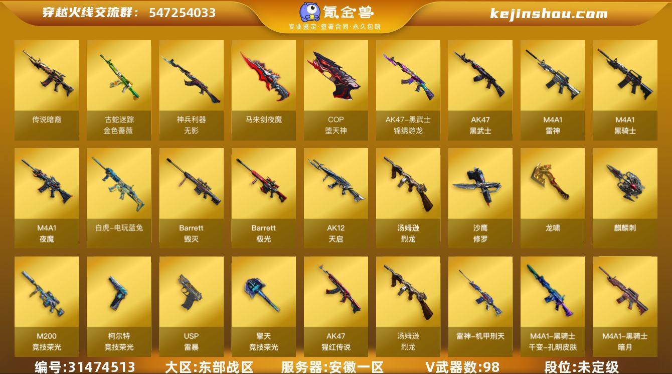 安徽一区-103V-1王者武器数-0炫金武器数 【传说武器】:传说暗裔 【热门武器】:传说暗裔,金色蔷薇-古蛇迷踪,修罗-古蛇迷踪,M200-竞技荣光,白虎-电玩蓝兔,Cat-刀锋,M4A1-黑骑士*2,汤姆逊-烈龙,裁决-雪莉杨,USP-雷暴,COP-堕天神*2,沙鹰-修罗 【音效卡】:修罗-古蛇迷踪音效卡,M4A1-黑骑士音效卡,Barrett-碧霄极光音效卡*2,麒麟刺-百战金芒-盛典舞曲音效卡,炼狱-百战金芒-庆典舞曲音效卡,死神-雪域霜狐-怀旧音效卡,柯尔特-百战金芒-庆典舞曲音效卡,AWM-昌龙-怀旧音效卡,AK47-火麒麟-怀旧音效卡 【皮肤】:雷神-机甲刑天皮肤*2,雷神-维纳斯皮肤,雷神-云海游龙皮肤,雷神-化蛇 皮肤,雷神-诺拉 皮肤,M4A1-再燃火线,火麒麟-雷神,火麒麟-平天大圣*2,火麒麟-百城,毁灭-暗月,毁灭-黑大圣皮肤,毁灭-魔灵皮肤,毁灭-神秘黑洞皮肤,毁灭-虹光风暴 皮肤,毁灭-英雄计划 皮肤,M4A1-千变-孔明皮肤,黑骑士-暗月,M4A1-黑骑士-娜塔莉娅 皮肤,黑武士-典韦皮肤,AK47-B-常胜将军-刘备,AWM-再燃火线,屠龙-惊鸿 皮肤,龙啸-蛇姬 皮肤,轻型军用手斧-再燃火线,麒麟刺-月皮肤 【角色】:零,樱,魅影,凌霄,电竞教官-云悠悠,战地猎狐,雪域霜狐,蛇隐宗,暗夜-X,北极狐-X,初恋灵狐,电竞少女,芳心审判者,飞虎队-X,风暴女*2,嘉年华灵狐,疾风,荆棘玫瑰,娟娟,兰-海滩派对,兰-新年限定,兰妹妹,猎狐者-追月,0号玩家,零-水下丽影,灵狐者-X,灵狐者-七夕宝贝,龙儿-小淘气,麻雀,娜塔莉娅,潘多拉-X,潘多拉-甜心教官,青霞仙子,蛇姬,斯沃特-X,蜀雪,兔囡囡,维纳斯,雪莉杨-摸金校尉,夜玫瑰-宠粉,樱-战斗天使 【人偶武器】:裁决-雪莉杨,M4A1-雷神-精英刀锋,迷你钢铁终结者,迷你救赎猎手,AWM-灵狐-15周年嘉年华*2,M37-葵,Cat-刀锋,迷你深渊冰龙*2,迷你裂空之翼*4,迷你波特...