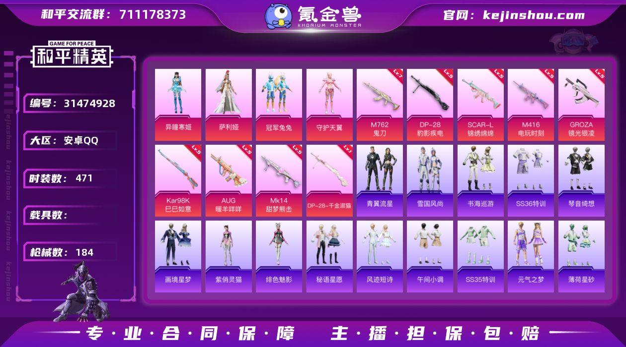 实名:不可二次实名 是否支持人脸包赔:支持 粉装数量:4 特效枪数量:9 时装数:471 枪械数:184 异瞳寒姬,冠军兔兔,守护天翼,萨利娅 七级M762-鬼刀,五级DP-28-豹影疾电,五级AUG-暖羊咩咩,五级GROZA-镜光银凌,五级Kar98K-巳巳如意,五级M416-电玩时刻,五级MK14-甜梦熊击,五级SCAR-L-锦绣绵绵,一级DP-28-千金淑猫 青翼流星,雪国风尚,画境星梦,琴音绮想,书海巡游,SS36特训,炫彩糖果,绯色魅影,紫俏灵猫,风迹短诗,秘语星愿,SS35特训,午间小调,元气之梦,薄荷星砂,云魄琉璃,狂鲨锋刃,SS34特训套装,游乐,8号机,Alan Walker,暗影哥特,冰川特警,缤纷果语,滨海厨神,冰河战士,白糯汤圆,贝斯之夜,春光漫游,长空猛禽,超能勇士,创世·幻影,纯真浪花,顶瓜瓜,蝶变,大橘大利,都市丽猫,绯格组合,风华少年志,粉恋花,光速穿梭者,龟仙人,光之冒险,海岛探路者,活力之心,湖畔霞光,黑色伏地魔,幻世战舞者,湖雨初晴,幻羽潜行,幻影武者,极地朋克,惊鸿侠骨,竞技达人朋克,竞技角斗士,竞技名士,街头潮人,街头风暴,锦衣飞扬,酷潮明星,空岛之星,快闪甜心,蓝冰羽,龙的传人,蓝海鲸歌,龙魂突击队,六六大吉,浪漫天命,恋语绒绒,绿洲跃动,漫步者,摩登魅猫,猛禽,棉花软糖,魅力单车,曼妙人鱼,明鸳圣池,霓虹街区,柠萌假日,青涩时光,青团波波,绒宝小鹅,热情海星,燃烧卡路里,热血青春,森林游猎者,SS25特训,SS26特训,SS27特训,SS28特训,SS29特训,SS30特训套装,SS31特训套装,SS32特训套装,SS33特训套装,巳巳如意,糖糖葫芦,特战英豪,特战装甲,王牌教练,新风雅兰,迅捷之星,小鸟芋圆,旭日情侣,雪山精英,香桃花海,星途旅人,云霞荷露,焰鹰斗篷,鱼渊荷华,幽夜迷踪,燕燕于飞,异域银装,智谋强哥,紫幽梦 炫彩糖果降落伞,炫彩糖果飞行器,异瞳寒姬降落伞,萌物绒绒飞行器,创世·救赎降落伞,镜光幻境降落伞,金丰海韵降落伞,精灵梦叶罗丽降落伞,恐龙拽拽降落伞,莲影清波降落伞,千金淑猫降落伞,圣堂之誓降落伞,桃粉嫣然降落伞