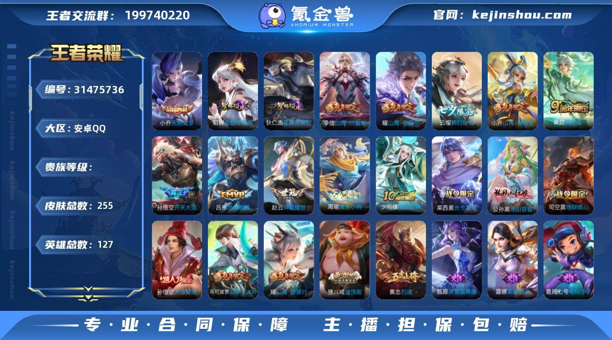 安卓Q-V5-永恒钻石I段位-127英雄-232皮肤-1典藏皮肤-10传说-67史诗 【荣耀典藏】:小乔天鹅之梦 【传说皮肤】:虞姬愿照岁时盈,桑启鸣野蒿,狄仁杰神器狴犴令,鲁班七号寅虎瑞焰,王昭君乞巧织情,西施游龙清影,曜李逍遥 ,小乔音你心动,孙悟空零号赤焰,貂蝉仲夏夜之梦 【限定皮肤】:蒙犽顽岩魄,姜子牙天穹之誓,杨戬破阵退雄兵,狄仁杰阴阳师,赵云皇家上将,墨子神迹守卫,鲁班七号乒乒小将,鲁班七号寅虎瑞焰,孙膑天狼运算者,白起夜都怪侠,芈月白晶晶,芈月幻夜卜梦,元歌云间偶戏,元歌无心,狄仁杰魔术师,狄仁杰万华元夜,狄仁杰神器狴犴令,达摩星际陆战队,达摩沙漠行僧,项羽海滩派对,老夫子醍醐杖,老夫子航海奇遇记,关羽冰锋战神,程咬金演武夺筹,韩信傲雪梅枪,兰陵王金庭之子,亚瑟潮玩骑士王,孙悟空零号赤焰,后羿圣弓游侠,李元芳云中旅人,钟馗驱傩正仪,杨玉环遇见飞天,雅典娜单词大作战,蔡文姬奇迹圣诞,鬼谷子原初探秘者,鬼谷子五谷丰年,大乔白鹤梁神女,黄忠火炮绅士,苏烈千军破阵,梦奇顽趣,沈梦溪大漠名商,裴擒虎李小龙,裴擒虎擒涛扼浪,米莱狄胡桃异想国,云中君纤云弄巧,上官婉儿神器万象笔,嫦娥如梦令,曜李逍遥 ,蒙犽狂想玩偶喵,鲁班大师探海日志,桑启海盐诗旅,艾琳女武神,阿古朵江河有灵,张良古海寻踪,高渐离燃音魔法,妲己灵卜魔法,鬼谷子天穹祈灯,姬小满妄想食味,沈梦溪龙舞盛年,刘邦剑破天穹,程咬金群星魔术团,芈月浮光幕影,周瑜熔金海岸 【年限皮肤】:鲁班七号寅虎瑞焰,虞姬愿照岁时盈 【赛季限定】:老夫子醍醐杖,鬼谷子原初探秘者,狄仁杰万华元夜,程咬金演武夺筹,钟馗驱傩正仪,苏烈千军破阵,达摩沙漠行僧,兰陵王金庭之子,沈梦溪大漠名商,李元芳云中旅人,桑启海盐诗旅,裴擒虎擒涛扼浪,鲁班大师探海日志,张良古海寻踪,鬼谷...