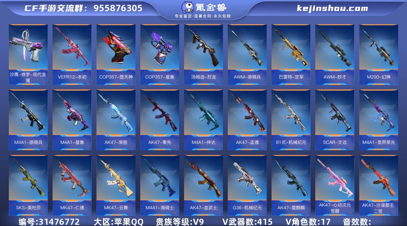 FC-7AEHE1 苹果QQ,成人号:是,角色等级:176,实名:有修改人脸机会/实名是本人,段位:大师SS,VIP等级:V9,V武器数量:415,V角色数量:17,V总数量:297,王者武器数:38,万化数量:652, 【人物角色】傲骨,蝴蝶,关小雨,英雄兰,香香,樱,堕天使,孤狼,葵,审判者,斯沃特,祝融夫人,炽天使-X,蔡文昭,雅典娜,零-水下丽影,职场灵狐-赛事经理,斯薇特, 【王者武器】王者之兽,王者之魄-冠军珍藏,蝴蝶刀-天神,唐刀-华夏传说,M12S-雷霆王者,雷霆王者之锋,M4A1-雷霆王者,王者之势闪光弹,王者之势手雷,王者之心手雷,王者之翼手雷,王者之心烟雾弹,王者之心闪光弹,王者之翼闪光弹,王者之影闪光弹,王者之影烟雾弹,王者之势烟雾弹,王者之翼烟雾弹,闪光弹-雷霆王者,烟雾弹-雷霆王者,高爆手雷-雷霆王者,王者之心,王者之影,王者之翼,王者之势,王者之怒,王者之光,王者之力,王者之魂,王者之轮,王者之电,王者之锋,王者之啸,王者之刺,王者之击,王者之烈,王者之神,王者之狱, 【至尊套装】M4A1-雷霆王者至尊,M12S-雷霆王者至尊,翼至尊,势至尊,光至尊,怒至尊,心至尊,魄至尊,神至尊,烈至尊, 【带V枪械】MK47-云舞-千变,王者之击-冰霜奇迹,AWM-天龙-英雄战甲,王者之翼手雷-冰霜奇迹,M200-幻神-战舞,王者之翼闪光弹-冰霜奇迹,09式狙-天神-千变,AK47-黑武士觉醒-金属蜂巢,加特林-炼狱-怒魔,王者之心闪光弹-HeartShot,AK47-火麒麟-暗月,王者之翼烟雾弹-冰霜奇迹,AK47-无影-荣耀酷本,MK5-机械纪元-蚀刻战甲,AK47-沙漠领主-邪神,双持斯泰尔-天使-血翼,G36-机械纪元,M4A1-海骑士,M4A1-竞界荣光,AK47-孟德-过载,M4A1-仲达,M4A1-雷神-萝拉,沙鹰-修罗-能量核心,M4A1-威侯,M4A1-Rush-夜袭,沙鹰-火麒麟-暗月,M4A1-樱龙·一觉,M4A1-星象,M4A1-竞技战魂,沙鹰-定...