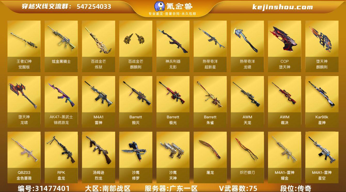 广东一区-76V-2王者武器数-1炫金武器数 【热门武器】:QBZ03-金色蔷薇,Kar98K-星神,金色小号,汤姆逊-烈龙*5,RPK-盘龙*2,COP-堕天神,沙鹰-修罗*4,炽芒蝶刃 【王者炫金武器】:王者凌虎,炫金骑士 【音效卡】:Barrett-毁灭音效卡,宋雨琦语音包,炼狱-百战金芒-庆典舞曲音效卡 【皮肤】:裁决-星际旅行 皮肤,烈龙-星空,雷神-暗月,雷神-星空,雷神-耀金皮肤,雷神-宇航兔皮肤,M4A1-再燃火线,毁灭-星空,毁灭-冠军之怒,毁灭-英雄计划 皮肤,黑龙-能量核心,M4A1-黑龙-361,无影耀金皮肤*2,AK47-黑武士-361,AWM-天龙-传奇白鲨,极光-能量核心,修罗耀金皮肤,轻型军用手斧-再燃火线 【角色】:葵,炫,迷迭香,奇洋探员,云海玲珑,暗夜-X,芳心审判者,飞虎队-X,风暴女,嘉年华灵狐,娟娟,葵-赛博朋克,0号玩家,潘多拉-X,潜龙队-X,蜀雪,兔囡囡 【人偶武器】:M4A1-雷神-精英刀锋,巴雷特-零-水下丽影,AWM-灵狐-15周年嘉年华,夺魂,灵狐娃娃手雷 【英雄级武器】:M4A1-雷神,无影-神兵利器,黑武士-锦绣游龙,超新星-热带奇洋,QBZ03-金色蔷薇,AWM-天龙,Barrett-毁灭,Barrett-极光,AWM-裁决,Barrett-朱雀,Kar98K-星神,王者幻神-觉醒版,RPK-盘龙*2,炼狱-百战金芒,汤姆逊-烈龙*5,沙鹰-修罗*4,沙鹰-天神,COP-雷霆,COP-堕天神,屠龙,麒麟刺-堕天神,炽芒蝶刃,龙啸-热带奇洋,龙啸-堕天神*2,麒麟刺-百战金芒,丛林匕首-玄豹,高爆手雷-雷霆*5,高爆手雷-堕天神*5,手雷-热带奇洋,高爆手雷-玄豹,闪光弹-雷霆*5,闪光弹-堕天神*5,闪光弹-玄豹*2,烟雾弹-雷霆*4,烟雾弹-堕天神*5,烟雾弹-玄豹 【道具】:BS战队炫彩背包,奇洋探员-海龟背包,炫彩背包,热带奇洋炫彩背包,百战金芒炫彩背包,超级背包,女皇终结者-魔龙之吻,救世主-黑桃战神,绿色巨人,灵魂忍者*2,妖姬,迷雾幽...