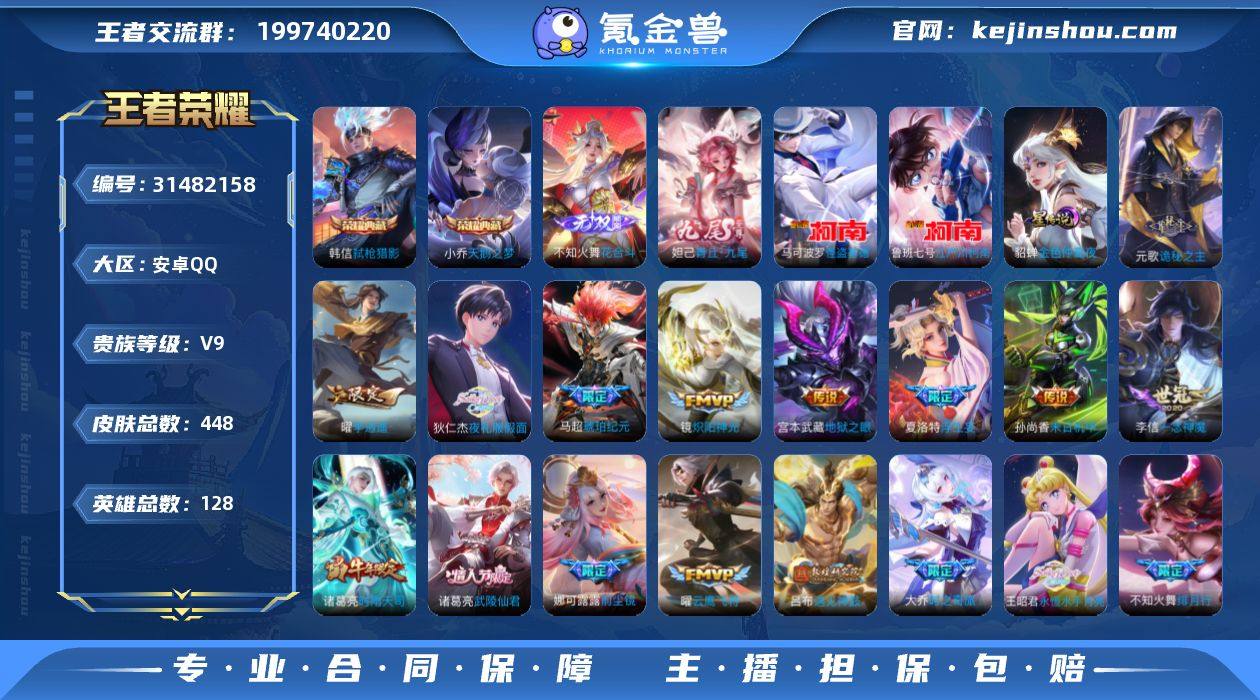 JL2870 绝版神奇女侠也有的 实名: 不可修改 贵族等级: V9 英雄数: 128 皮肤数: 448 荣耀水晶: 天鹅之梦,弑枪猎影 无双皮: 青丘·九尾,花合斗 珍品传说: 江户川柯南,怪盗基德 星传说: 金色仲夏夜 传说皮: 云鹰飞将,炽阳神光,一念神魔,云霓雀翎,末日机甲-孙尚香,仲夏夜之梦,零号·赤焰,地狱之眼,音你心动-周瑜,李逍遥,淬星耀世,遇见胡旋,挚爱之约,音你闪耀,碎云,炽翼辉光,燃星之曲,画中仙,浮生妄,记忆之芯,百相守梦(张飞),鹤羽星尊,妄想实况,惊梅引,遇见神鼓,大乔-时之奇旅,永恒水手月亮,夜礼服假面,琥珀纪元铠,琥珀纪元马超,诡秘之主,神树通天,纵目迁山 限定皮: 冰锋战神,遇见飞天,李小龙,游园惊梦,梁祝,时雨天司,白鹤梁神女,魔法小厨娘,岱宗,天狼溯光者,虎魄,神威,蜜橘之夏,乒乒小将,逐梦之音,天狼狩猎者,冰霜恋舞曲,天狼运算者,逐梦之影,神奇女侠,天狼绘梦者,青龙志,玄武志,朱雀志,至尊宝,武陵仙君,如梦令-后羿,大圣娶亲,高山流水,孙行者,傲雪梅枪,玉兔公主,启示之音,前尘镜,枫霜尽,时之奇旅-妲己,五谷丰年,绯月行,神器·万象笔,降魔,至美·化雀舞,至美·乘鲤谣,鸣野蒿,陌上桑,逐霄战戟