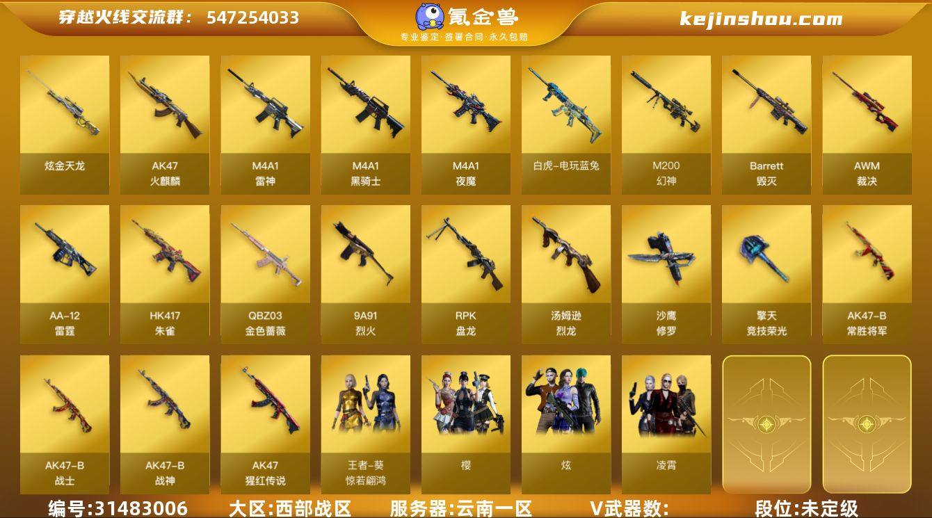 6796,西部,云南一区,可排位,75v,幻神,幻神黄忠,王者幻神,觉醒版,QBZ金色蔷薇,白虎电玩蓝兔,夜魔套装,破空枪刃夜魔,朱雀,机械迷城穹宇,炼狱百战金芒,炼狱百战金芒庆典舞曲音效卡,【四防角色,王者葵貂蝉,】,【角色】,凌霄,樱,炫,零纪元,葵阿尔法武装,云海玲珑,【音效卡,黑骑士音效卡,】,【枪皮】,黑骑士摸金校尉,修罗百战金芒,火麒麟心动糖果,黑骑士冠军之势,王者武器,王者之魄,王者之烈,炫金武器,炫金天龙,【小人枪,雷神精英刀锋,火麒麟零纪元,裁决雪莉杨,加特林机械猎手,】,永久AC,有过十年记录,找回包赔