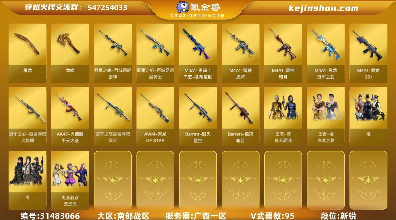 【FC-gMcqBE】四防艾莉莎云悠悠王者葵/幻神+宠儿+N9/竞技套/白虎3皮+qbz金色蔷薇冠军之薇/6盘龙炼狱+小刚6烈龙死亡之眼/冠军之特*4/usp雷暴+神功天巧/cop堕天神/冠军之刃/毁灭雷神冠军三件套/ 广西一区,等级102,王者武器6,炫金武器1,V武器95, 【英雄角色】传说艾莉莎,零,樱,电竞教官-云悠悠,职业选手,云海玲珑,猎狐者,王者樱-热浪之夏,王者葵-惊若翩鸿, 【V武器】M200-幻神,M200-竞技荣光,Barrett-毁灭,AWM-裁决,Scar Light-白虎,QBZ03-金色蔷薇,RPK-盘龙,加特林-炼狱,汤姆逊-烈龙,烈龙-云海游龙,柯尔特-冠军之特,柯尔特-竞技荣光,USP-雷暴,USP-神工天巧,COP-堕天神,Knife-冠军之刃,barrett-金色蔷薇,M4A1-雷神,M4A1-黑骑士,M4A1-黑龙,M4A1-青龙,M4A1-龙血,M4A1-死神,AK47-火麒麟,AK47-无影,AK47-黑鲨,AK47-黑武士,烈火-动感闪耀,AK12-天启,无影-神兵利器,黑武士-锦绣游龙,机械迷城-穹宇,沙鹰-修罗,沙鹰-天神,修罗-云海游龙,天神-动感闪耀,屠龙,麒麟刺,龙啸,擎天,擎天-竞技荣光,屠龙-动感闪耀,屠龙-云海游龙,马来剑-夜魔,唐刀-古蛇迷踪,龙啸-烈火龙威,擎天-云海游龙,麒麟刺-百战金芒,高爆手雷-夜魔,闪光弹-夜魔,烟雾弹-夜魔,高爆手雷-竞技荣光,闪光弹-竞技荣光,烟雾弹-竞技荣光,高爆手雷-古蛇迷踪,烟雾弹-古蛇迷踪,超新星-热带奇洋,龙啸-热带奇洋,高爆手雷-雷霆王者,手雷-云海游龙,手雷-热带奇洋,手雷-动感闪耀,M4A1-再燃火线,龙啸-云海游龙, 【王者武器】玫瑰精灵-悦动,超新星-悦享-觉醒版,王者之力-觉醒版,王者之击-觉醒版,闪光弹-雷霆王者-觉醒版,高爆手雷-雷霆王者, 【狙击枪稀有皮肤】幻神-宠儿-2021MVP,M200-幻神-N9-2022MVP,毁灭-星空,毁灭-航天科技皮肤,毁灭-冠军之怒,毁灭-暗月,天龙-CFSTAR,极光-能量核心...