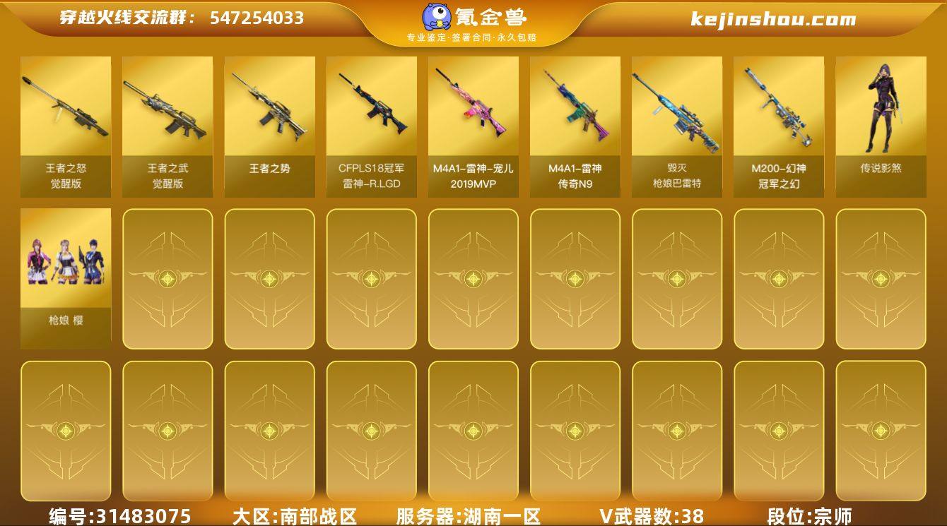 【FC-pzJSBN】湖南一区,等级102,传说武器2,王者武器3,V武器38, 【英雄角色】传说影煞,枪娘樱,雷霆-α,猎狐者, 【传说武器】传说破晓,传说灵眸, 【V武器】M200-幻神,Kar98K-星神,Barrett-暗月传说,AWM-裁决,QBZ191-银翼游侠,QBZ03-云龙,QBZ03-金色蔷薇,RPK-盘龙,汤姆逊-烈龙,炽芒蝶刃,M4A1-雷神,AK47-火麒麟,AK12-天启,黑武士-锦绣游龙,沙鹰-天神,屠龙,龙啸,擎天,斩神刀-雷暴,唐刀-古蛇迷踪,雷霆之锋,龙啸-烈火龙威,云龙扇,高爆手雷-雷暴,闪光弹-雷暴,烟雾弹-雷暴,高爆手雷-云龙,闪光弹-云龙,烟雾弹-云龙,高爆手雷-雷霆,闪光弹-雷霆,烟雾弹-雷霆,烟雾弹-古蛇迷踪,超新星-热带奇洋,龙啸-热带奇洋,手雷-热带奇洋,龙啸-云海游龙, 【王者武器】王者之势,王者之武-觉醒版,王者之怒-觉醒版, 【狙击枪稀有皮肤】幻神-冠军之幻,幻神-电流骇客 皮肤,毁灭-枪娘巴雷特, 【步枪稀有皮肤】白虎-白鲨-CFPLS23冠军,雷神-宠儿-2019MVP,雷神-R.LGD-CFPLS18冠军,雷神-传奇N9,天启-高能霹雳 皮肤, 【近身武器稀有皮肤】屠龙-星火燎原,龙啸-巅峰荣耀 皮肤,屠龙-星耀 皮肤, 【音效道具】M200-幻神音效卡,M4A1-雷神音效卡, 【小人枪】巴雷特-零-水下丽影,夺魂,COP-白鲨, 【武器】手雷-2017万圣节,死亡之眼,源·青龙,源·天龙,源-金色蔷薇,源·雷神,源·机械迷城,源·火麒麟,AK47-青龙,凤凰之息,灵·QBZ03-金色蔷薇-嘉年华, 【挑战大师】巨龙咆哮Ⅲ,征服者,