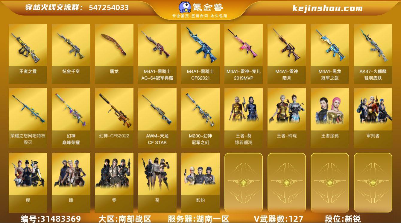 【FC-e5MLVJ】湖南一区,等级102,传说武器1,王者武器12,炫金武器1,V武器127, 【英雄角色】传说艾莉莎,传说星骇,王者炫,王者春,王者炽天使,王者玲珑,隼,兰-巾帼英雄,荒漠琉璃,月兔特工,晴雅,审判者,零,樱,影豹,葵,瞳,灵狐者-职业经理,王者涂鸦,王者葵-惊若翩鸿, 【传说武器】传说夜影, 【V武器】M200-幻神,M200-竞技荣光,Kar98K-星神,Barrett-毁灭,AWM-裁决,QBZ03-天罚,QBZ03-金色蔷薇,M4A1-幻灵,M4A1-神工天巧,加特林-炼狱,汤姆逊-烈龙,柯尔特-竞技荣光,USP-神工天巧,USP-冥王,COP 357-幻灵,Knife-冠军之刃,炽芒蝶刃,Barrett-极光,Barrett-朱雀,AWM-天龙,M4A1-雷神,M4A1-黑骑士,M4A1-黑龙,M4A1-千变,M4A1-猎神,M4A1-青龙,M4A1-玫瑰精灵,M4A1-武圣,M4A1-龙血,M4A1-死神,AK47-火麒麟,AK47-无影,AK47-黑鲨,AK47-黑武士,AK47-机械迷城,烈火-动感闪耀,AK12-天启,无影-神兵利器,机械迷城-穹宇,沙鹰-修罗,沙鹰-天神,天神-动感闪耀,Glock18-武圣,屠龙,丛林匕首-玄豹,麒麟刺,龙啸,擎天,擎天-竞技荣光,幻灵之锋,屠龙-动感闪耀,高爆手雷-幻灵,闪光弹-幻灵,烟雾弹-幻灵,高爆手雷-竞技荣光,闪光弹-竞技荣光,烟雾弹-竞技荣光,高爆手雷-神工天巧,闪光弹-神工天巧,烟雾弹-神工天巧,手雷-动感闪耀, 【王者武器】炼狱-悦蓝-觉醒版,王者之烈-觉醒版,王者之光-觉醒版,王者之霆,王者风神-觉醒版,王者之势-觉醒版,白虎之魄-觉醒版,王者之啸-觉醒版,王者之魂-觉醒版,王者之武-觉醒版,王者风神-觉醒版,QBZ-03-王者蔷薇-觉醒版, 【狙击枪稀有皮肤】幻神-CFS2022,幻神-冠军之幻,幻神-巅峰荣耀,幻神-动感闪耀 皮肤,M200-幻神-荣耀世冠白鲨,幻神-青鹤,星神-漫游,Kar98K-星神-冠军之星皮肤,裁决-运输船 皮肤,毁灭-荣耀之怒,毁