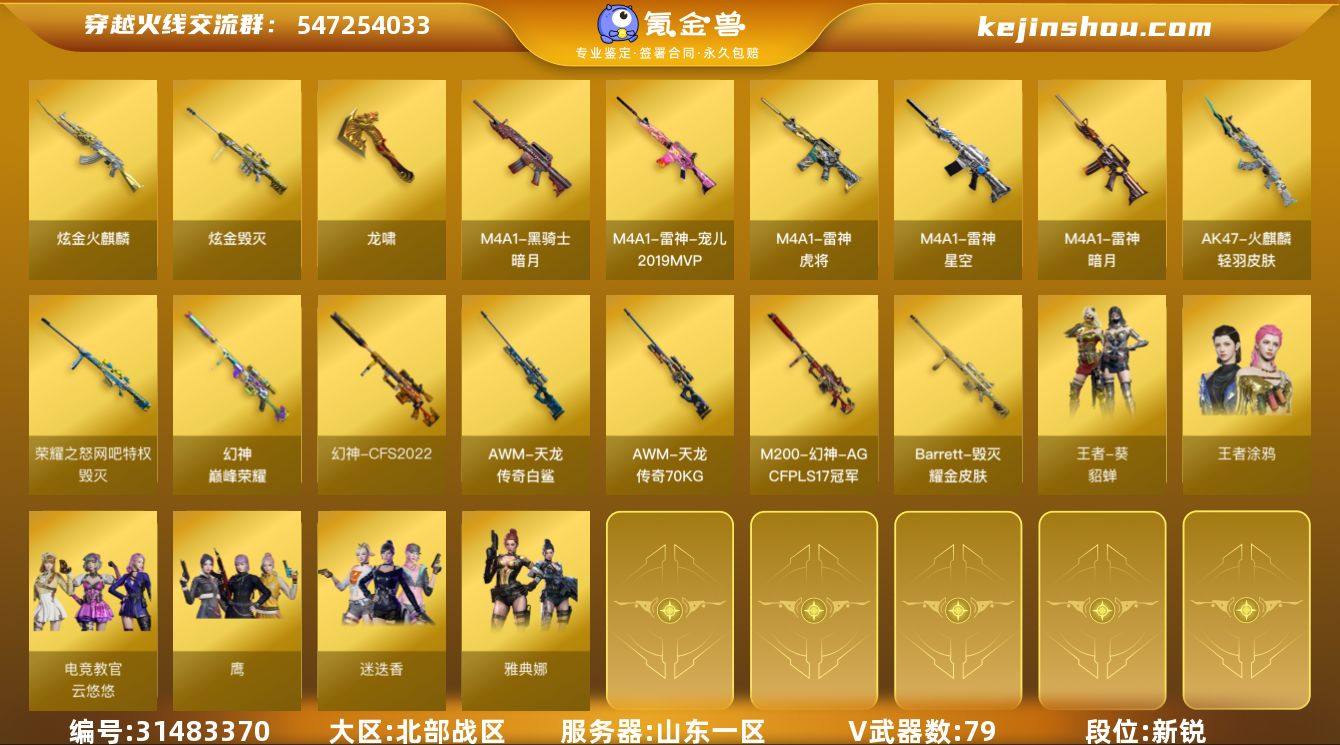 【FC-vWdSGk】山东一区,等级102,传说武器1,王者武器13,炫金武器3,V武器79, 【英雄角色】雅典娜,王者-葵-貂蝉,王者沙漠玫瑰,迷迭香,鹰,电竞教官-云悠悠,职业选手,灵狐者-黄金海岸,猎狐者,王者涂鸦, 【传说武器】传说光耀, 【V武器】M200-幻神,M200-竞技荣光,Kar98K-星神,Barrett-暗月传说,Barrett-毁灭,Scar Light-白虎,白虎-电玩蓝兔,RPK-盘龙,加特林-炼狱,汤姆逊-烈龙,柯尔特-竞技荣光,柯尔特-电竞装甲,USP-雷暴,AWM-天龙,M4A1-雷神,M4A1-黑骑士,AK47-黑鲨,黑武士-CF网剧冠军,无影-神兵利器,沙鹰-修罗,天神-CF网剧冠军,屠龙,麒麟刺,龙啸,擎天-竞技荣光,斩神刀-雷暴,擎天-CF网剧冠军,麒麟刺-百战金芒,高爆手雷-雷暴,闪光弹-雷暴,烟雾弹-雷暴,烟雾弹-电竞装甲,高爆手雷-竞技荣光,闪光弹-竞技荣光,烟雾弹-竞技荣光,恶棍-电竞装甲,M4A1-再燃火线,AK-47-猩红传说, 【王者武器】王者之心-觉醒版,王者之魄-觉醒版,王者之灵-觉醒版,王者之啸-觉醒版,王者冰魄-觉醒版,烟雾弹-雷霆王者-觉醒版,雷霆王者之锋-觉醒版,闪光弹-雷霆王者-觉醒版,王者之城-觉醒版,王者星神-觉醒版,王者之怒-觉醒版,QBZ-03-王者蔷薇-觉醒版, 【狙击枪稀有皮肤】幻神-CFS2022,幻神-AG-CFPLS17冠军,幻神-巅峰荣耀,毁灭-荣耀之怒,毁灭耀金皮肤,毁灭-神秘黑洞皮肤,毁灭-黑大圣皮肤,AWM-天龙-传奇70KG,AWM-天龙-传奇白鲨, 【步枪稀有皮肤】白虎-电玩粉兔皮肤,雷神-荣耀之魄,雷神-宠儿-2019MVP,雷神-宇航兔皮肤,雷神-星空,雷神-暗月,雷神-虎将,雷神-耀金皮肤,雷神-赛博朋克,火麒麟-轻羽皮肤,黑骑士-电玩青兔皮肤,黑骑士-暗月,黑骑士-摸金校尉,AK47-B-常胜将军-孙权,无影-能量核心,无影-霓裳皮肤, 【机枪稀有皮肤】炼狱-玩具枪皮肤, 【副武器稀有皮肤】修...